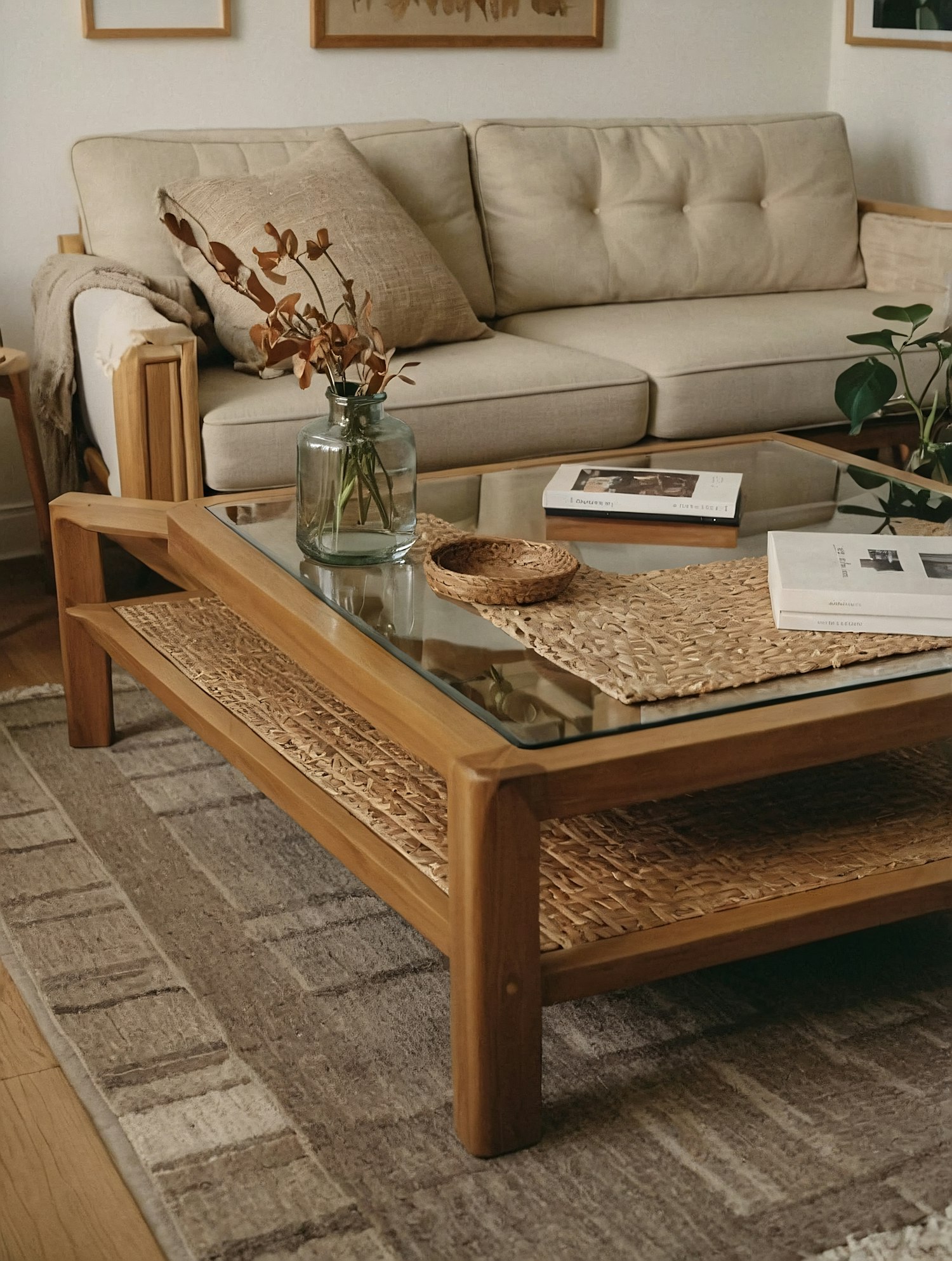 Cozy living room with a beige sofa, wooden coffee table, dried foliage in a vase, and earthy decor for a warm, natural vibe.