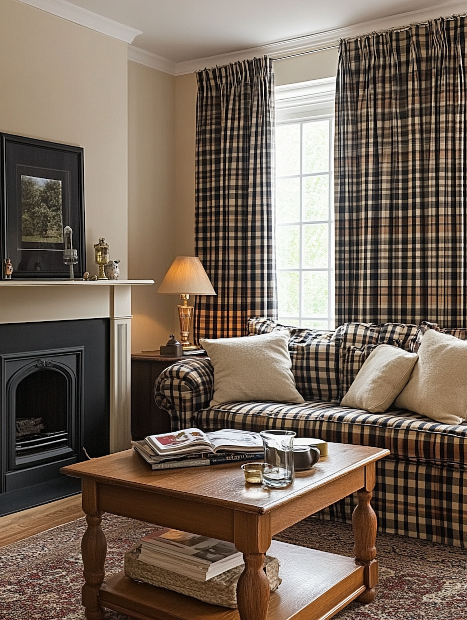 Cozy living room with plaid sofa, matching curtains, wooden coffee table, and a black fireplace. Warm lighting and traditional decor.