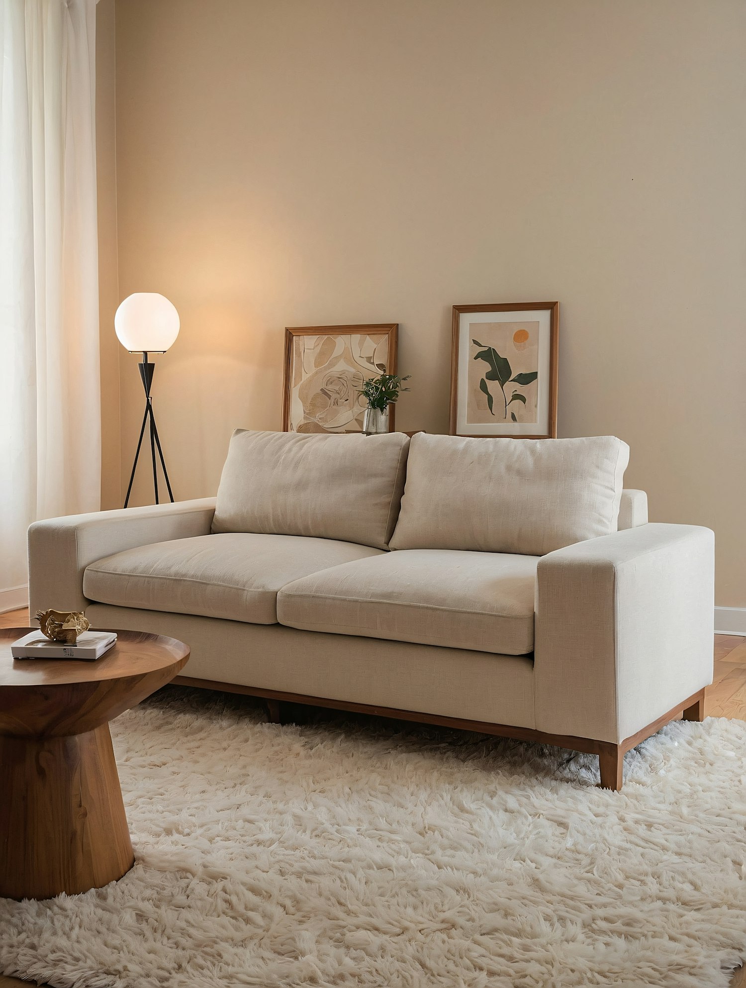 Cozy living room with a beige sofa, white shag rug, botanical prints, and a modern floor lamp. Perfect for minimalist decor inspiration.