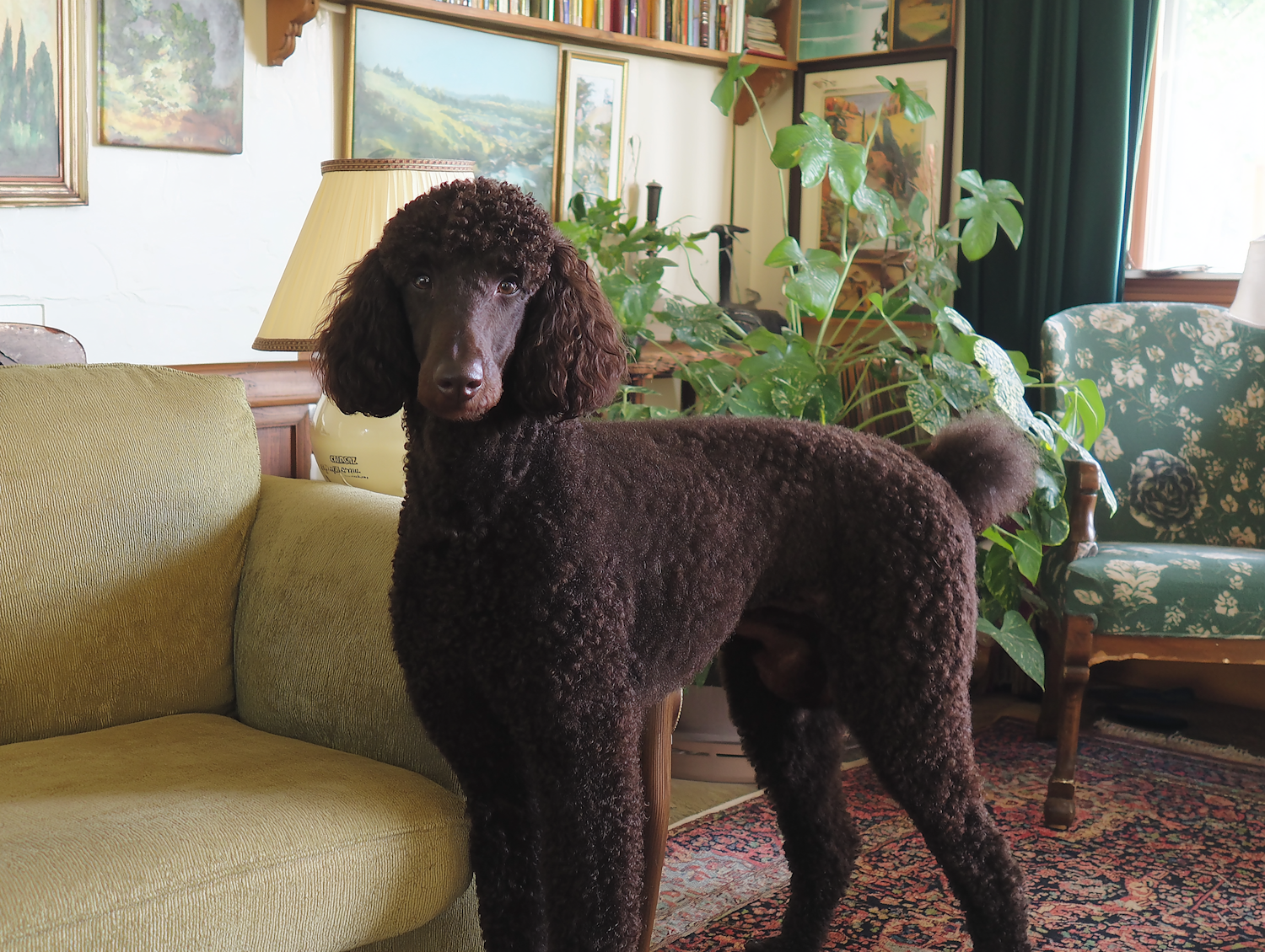 A chocolate standard poodle with curly brown fur stands in a cozy living room with green furniture, potted plants, and landscape paintings.