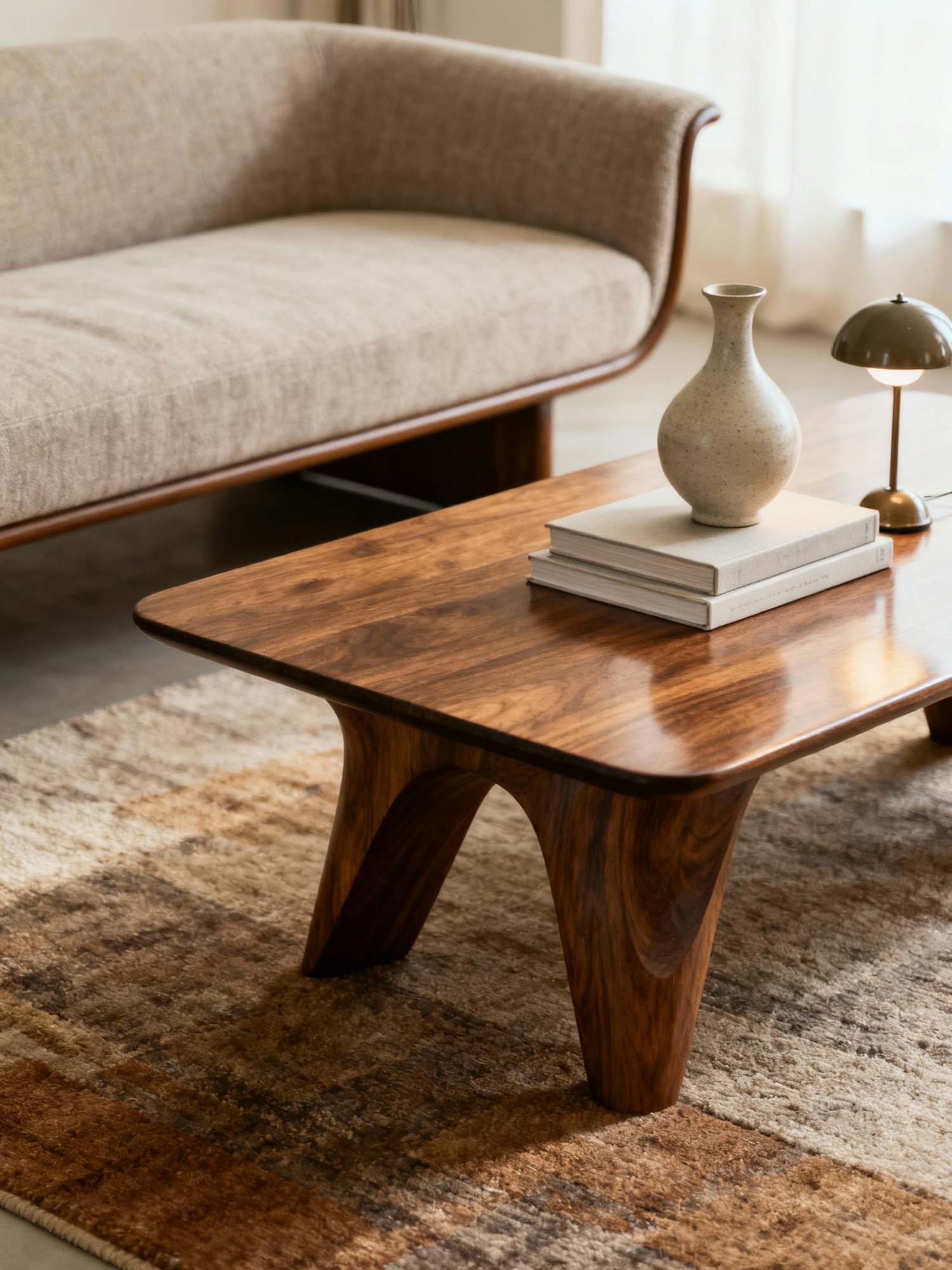 Professional interior design photography, warm and textured atmosphere, soft natural lighting, retro-modern aesthetic, mid-century inspired furniture, crafted wooden details, neutral tones with accents of earthy colors, editorial style, timeless and sophisticated mood. A crafted wooden coffee table with sculptural legs, styled with ceramic vases, minimalist books, and a small retro lamp. The background shows part of a retro-modern sofa and textured rug. The photo emphasizes the craftsmanship of the table, with soft natural light creating subtle highlights on the polished wooden surface.