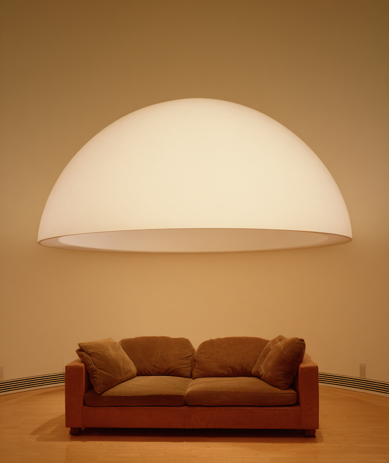 A warm, inviting living space with a brown sofa and a large dome-shaped light fixture creating a cozy ambiance.