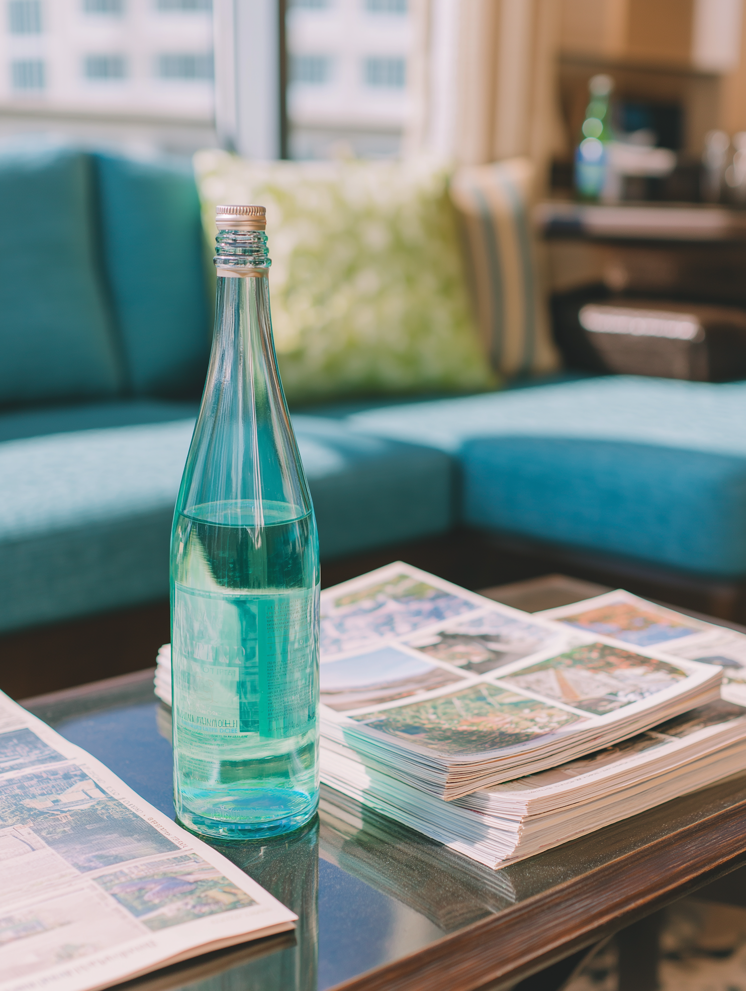 A clear glass bottle on a table with magazines and a newspaper, set in a cozy living room with a blue sofa and natural light.