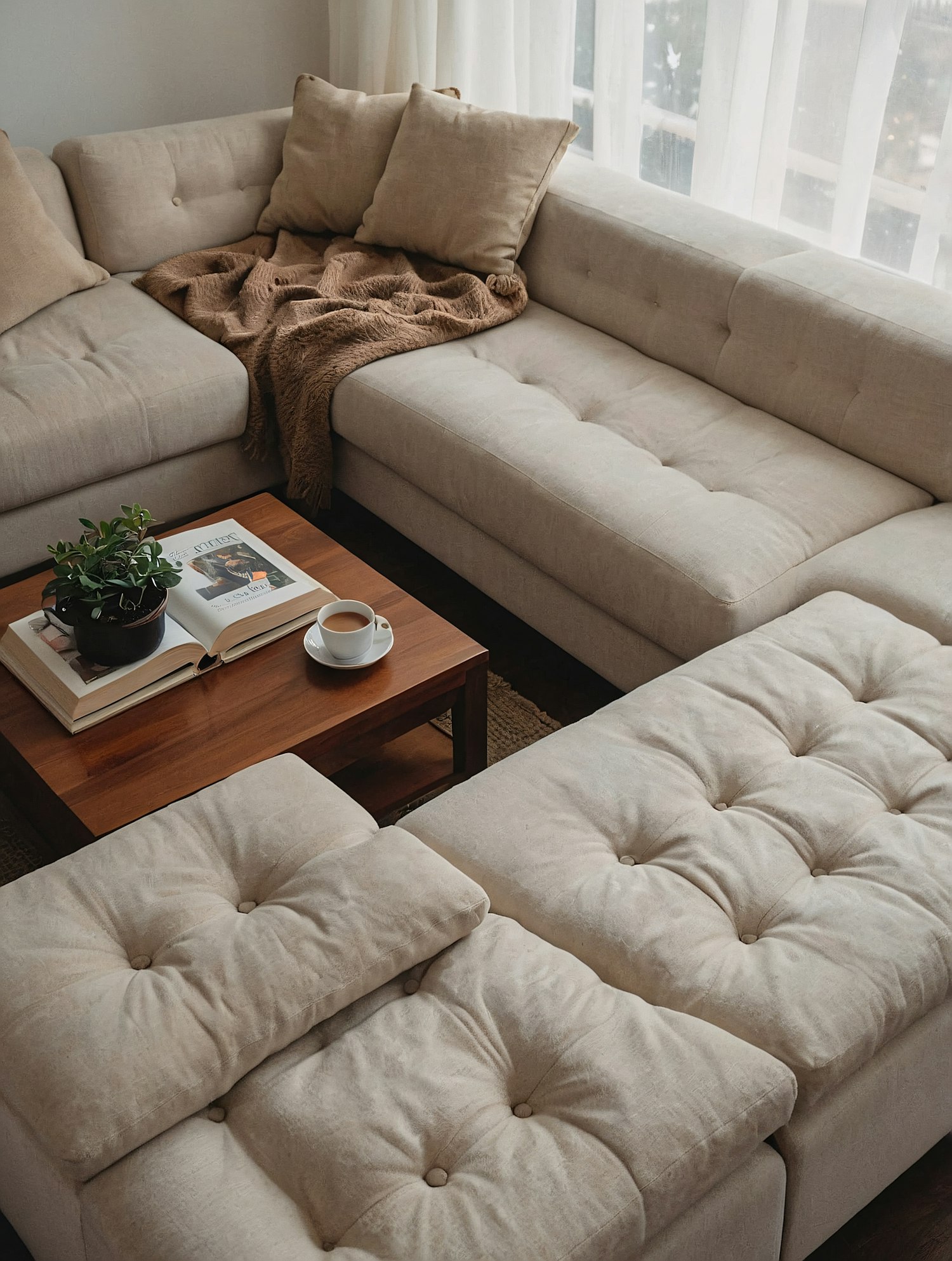 Cozy living room with a beige sectional sofa, wooden coffee table, open book, potted plant, and soft natural light through sheer curtains.