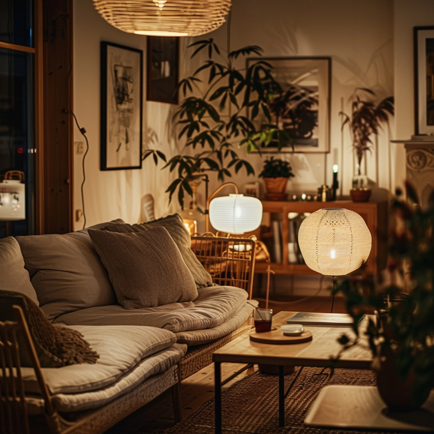 Cozy living room with warm lighting, beige sofa, wooden coffee table, woven lamp, and lush green plants for a serene ambiance.