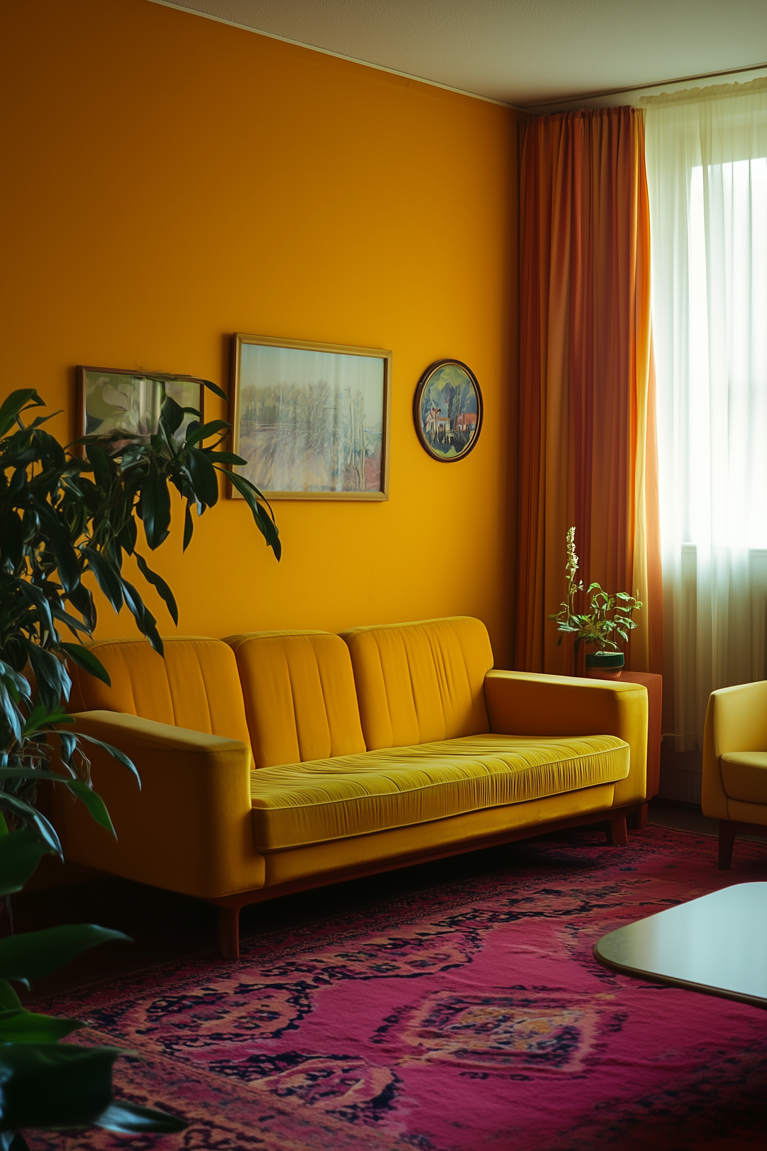 Vibrant yellow living room with retro sofa, bold pink rug, and elegant artwork. Natural light filters through sheer curtains.