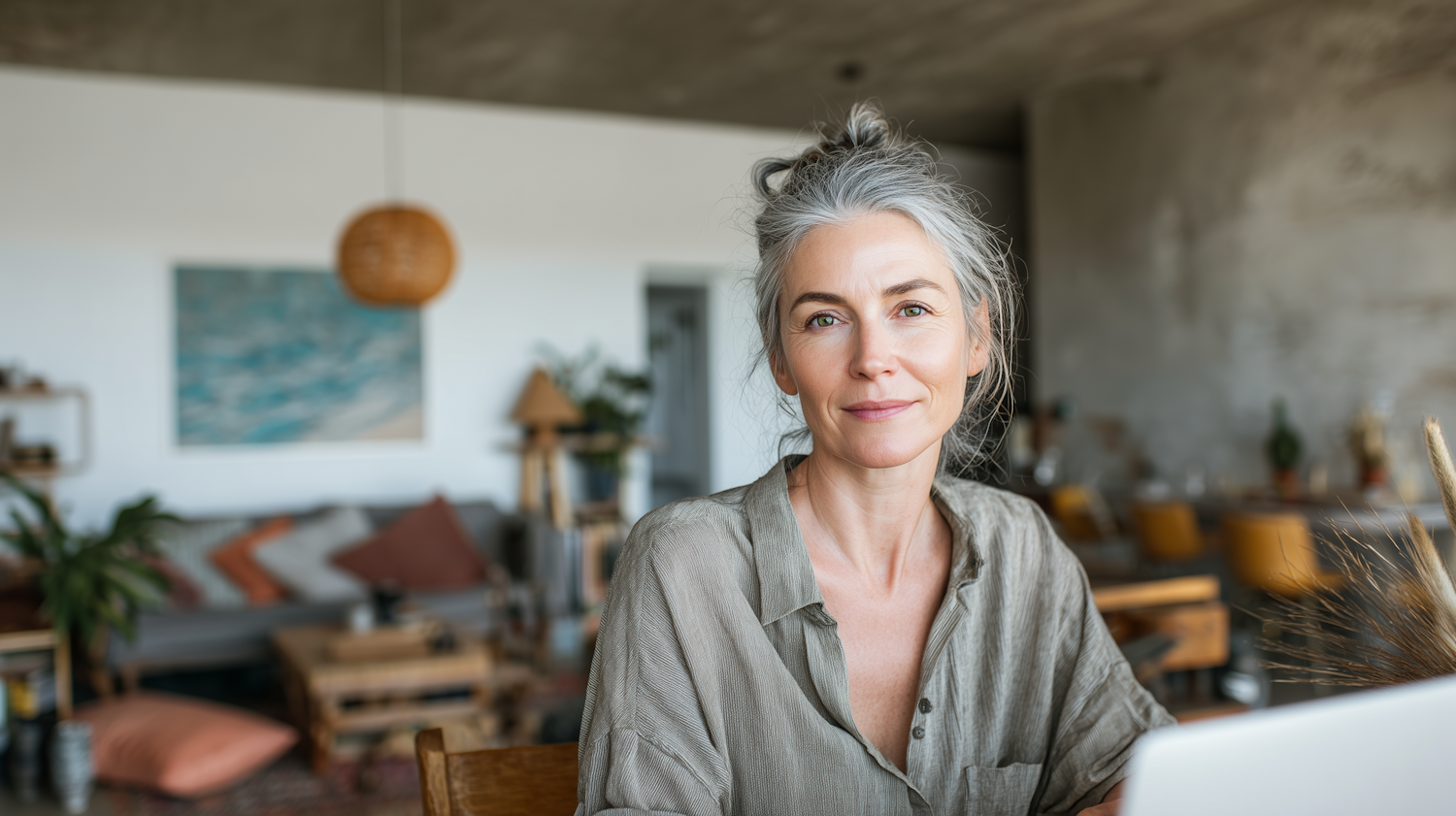 A serene portrait of a woman in a cozy, modern living space with warm tones and natural decor elements.