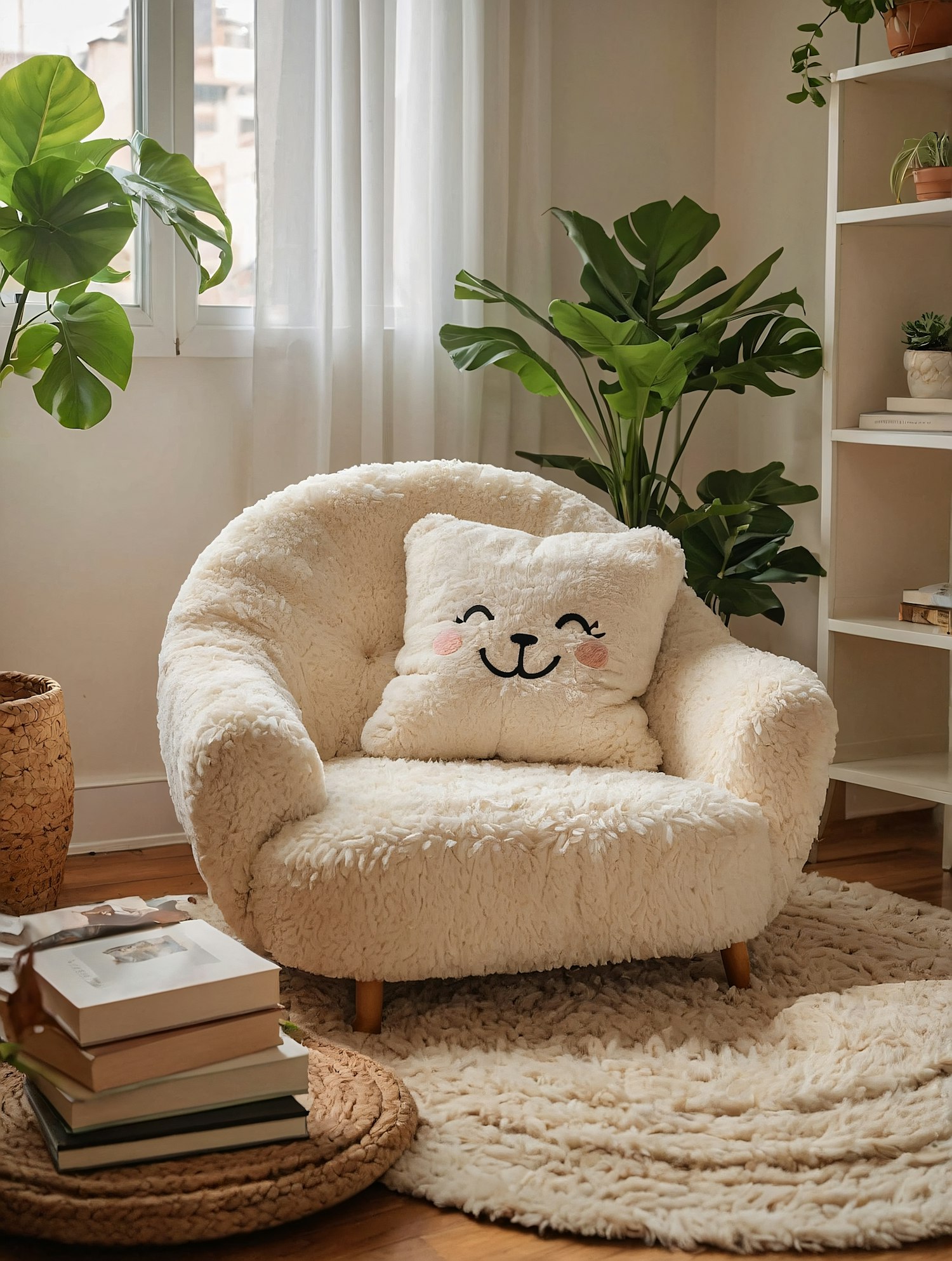 Cozy armchair with a cute smiling pillow, surrounded by lush plants, books, and soft natural light for a serene vibe.