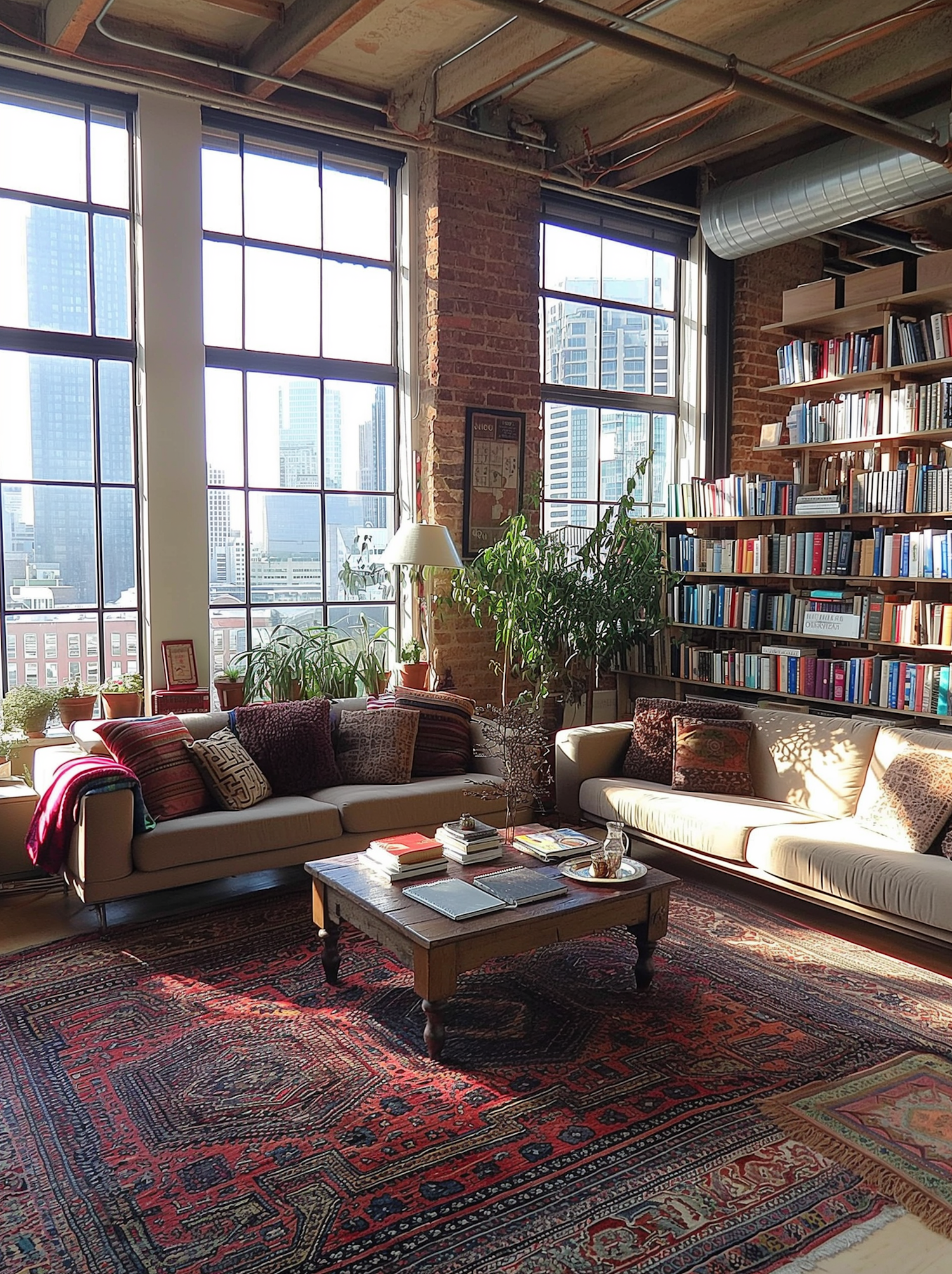 Cozy living room with large windows, beige sofas, a Persian rug, and a bookshelf. Urban loft vibe with natural light and greenery.