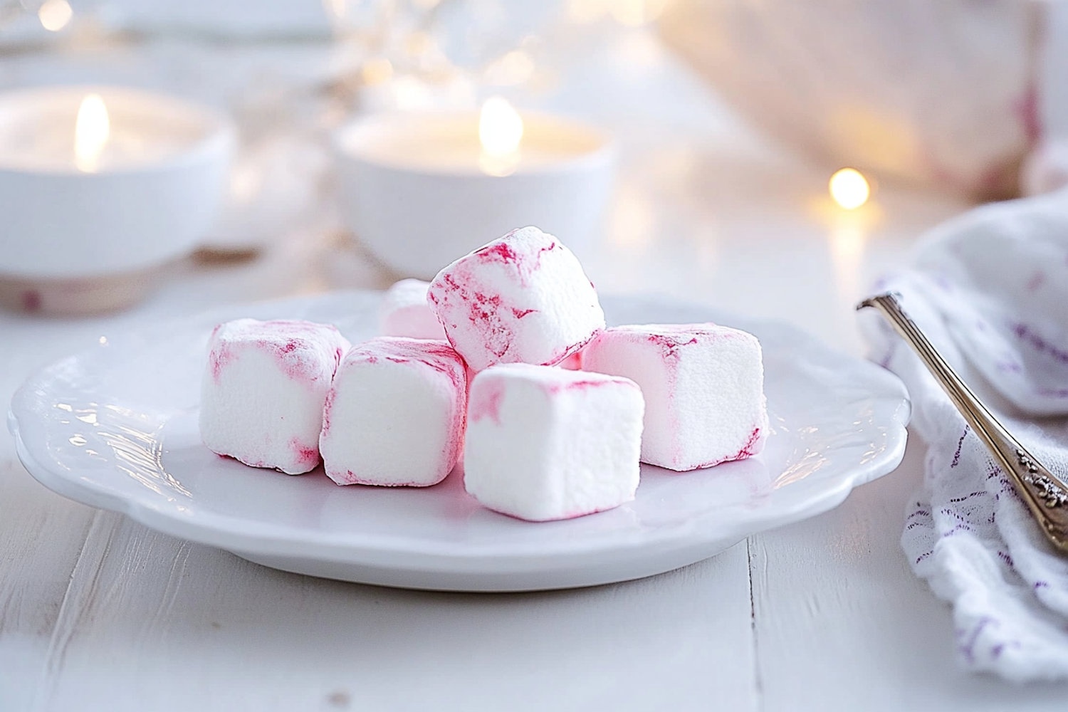Delicate pink-swirled marshmallows on a white plate with a cozy candlelit background, creating a serene and inviting atmosphere.