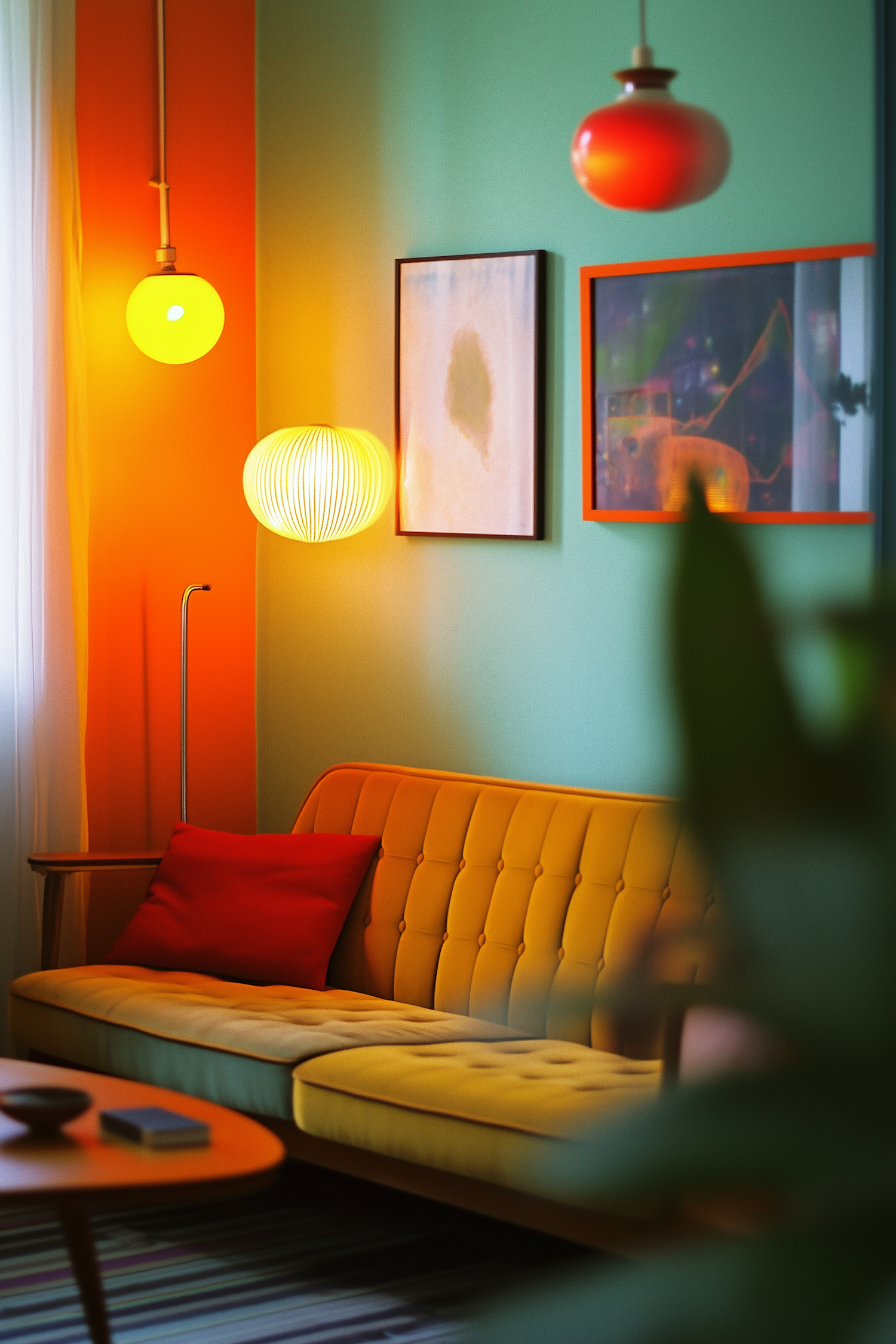 Retro living room with mustard sofa, red cushion, mint walls, and warm lighting. Mid-century modern charm with vibrant colors.