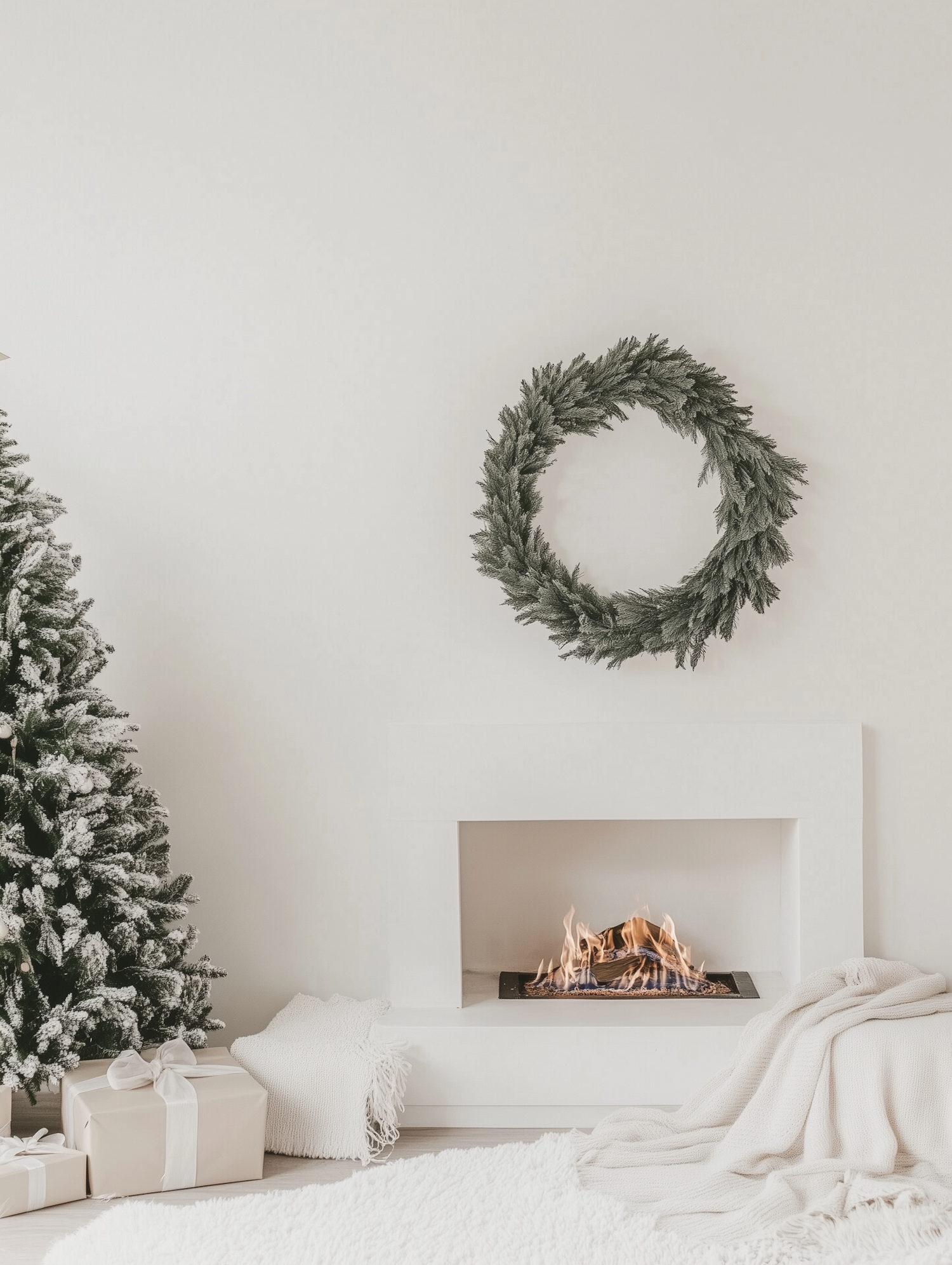 Minimalist holiday decor with a white fireplace, green wreath, snowy Christmas tree, and wrapped gifts in a cozy living room.