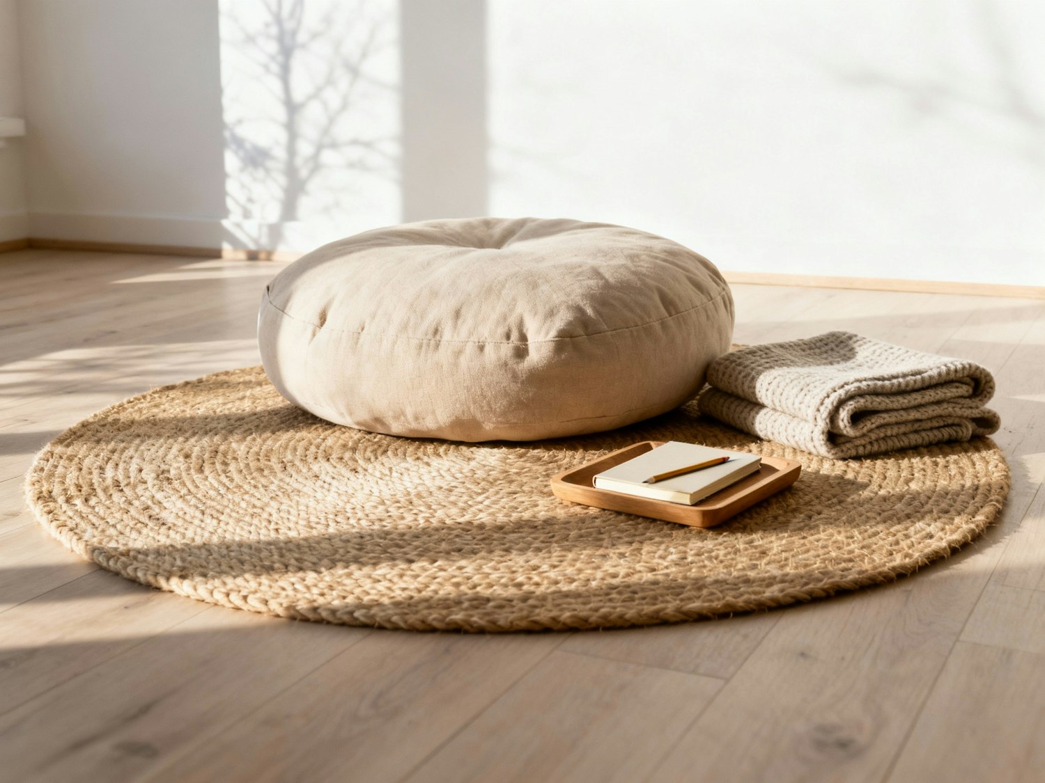 Minimalist interior with a jute rug, beige cushion, folded blanket, and a wooden tray with a notebook, bathed in soft natural light.