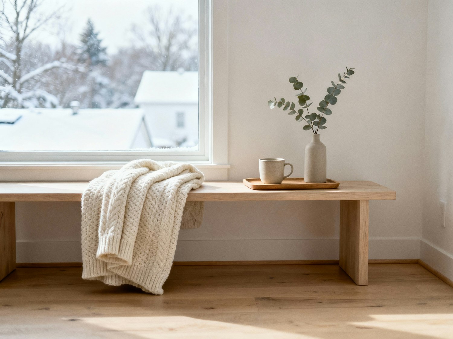 A cozy wooden bench with a knitted blanket, a mug, and a vase with eucalyptus branches, set against a snowy window view.
