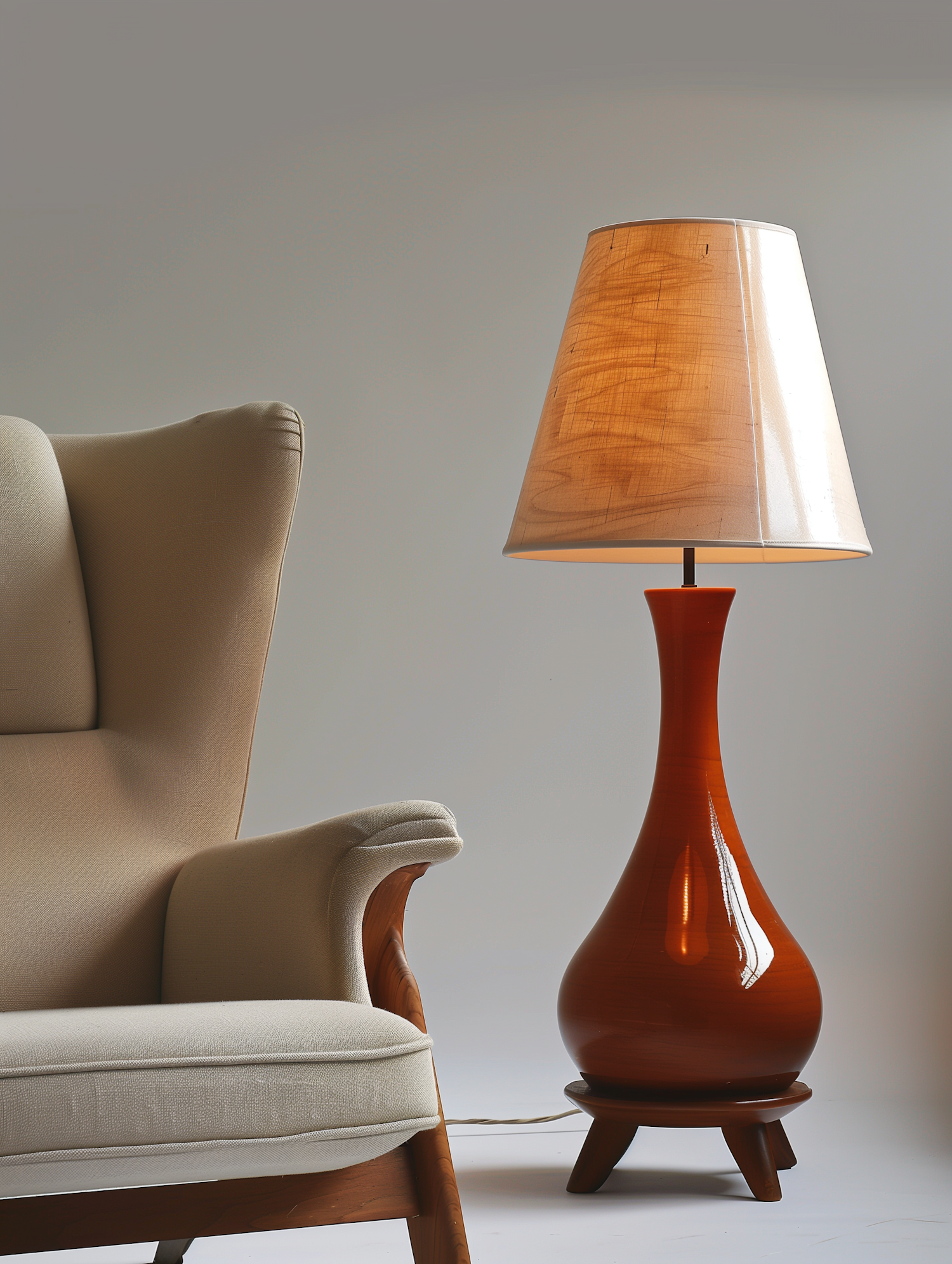 Minimalist setup with a beige armchair and a glossy orange ceramic lamp with a wood-textured shade on a wooden base.