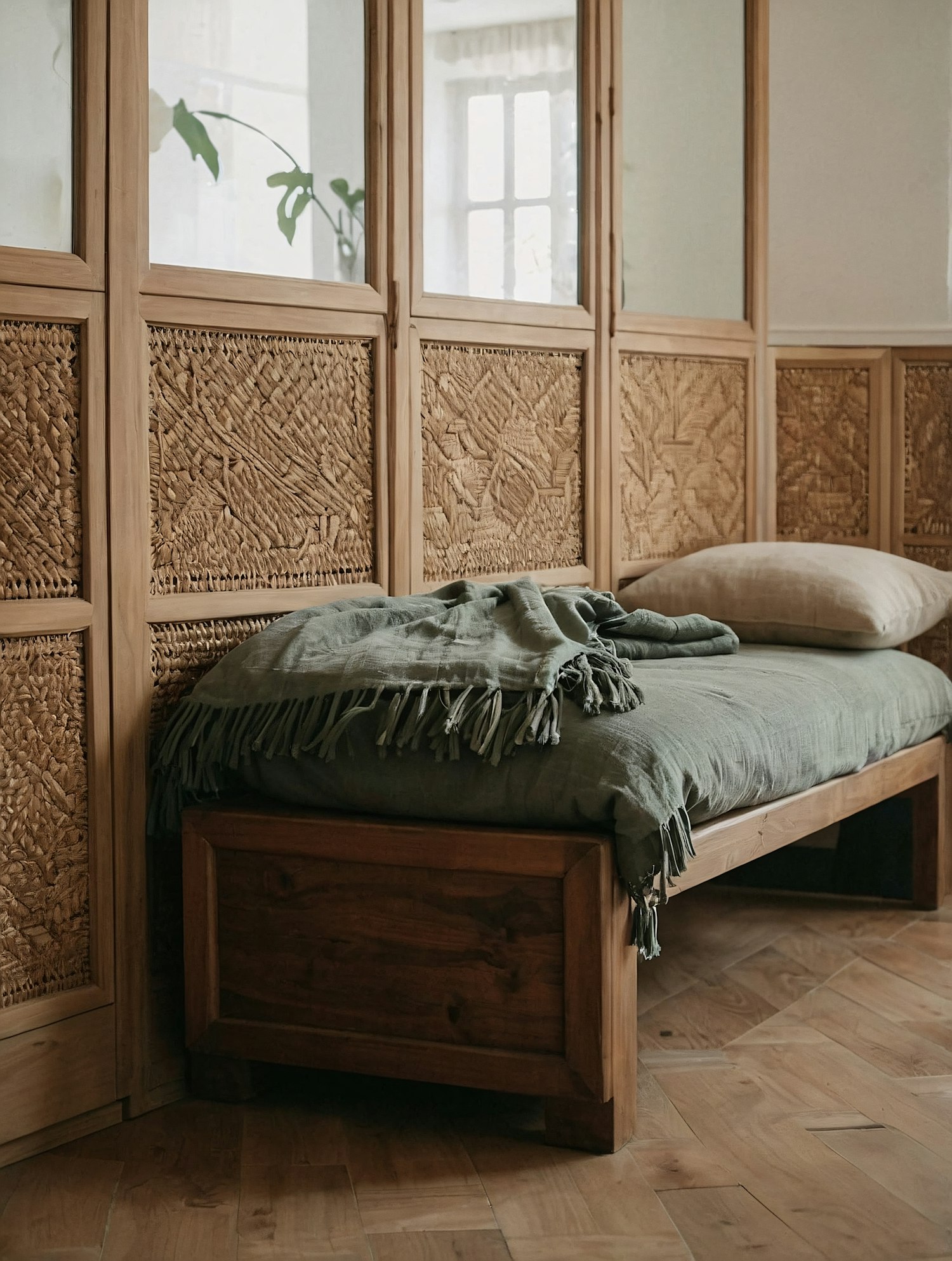 Minimalist wooden daybed with green throw and beige pillow, set against a rattan-paneled partition in a softly lit, rustic interior.