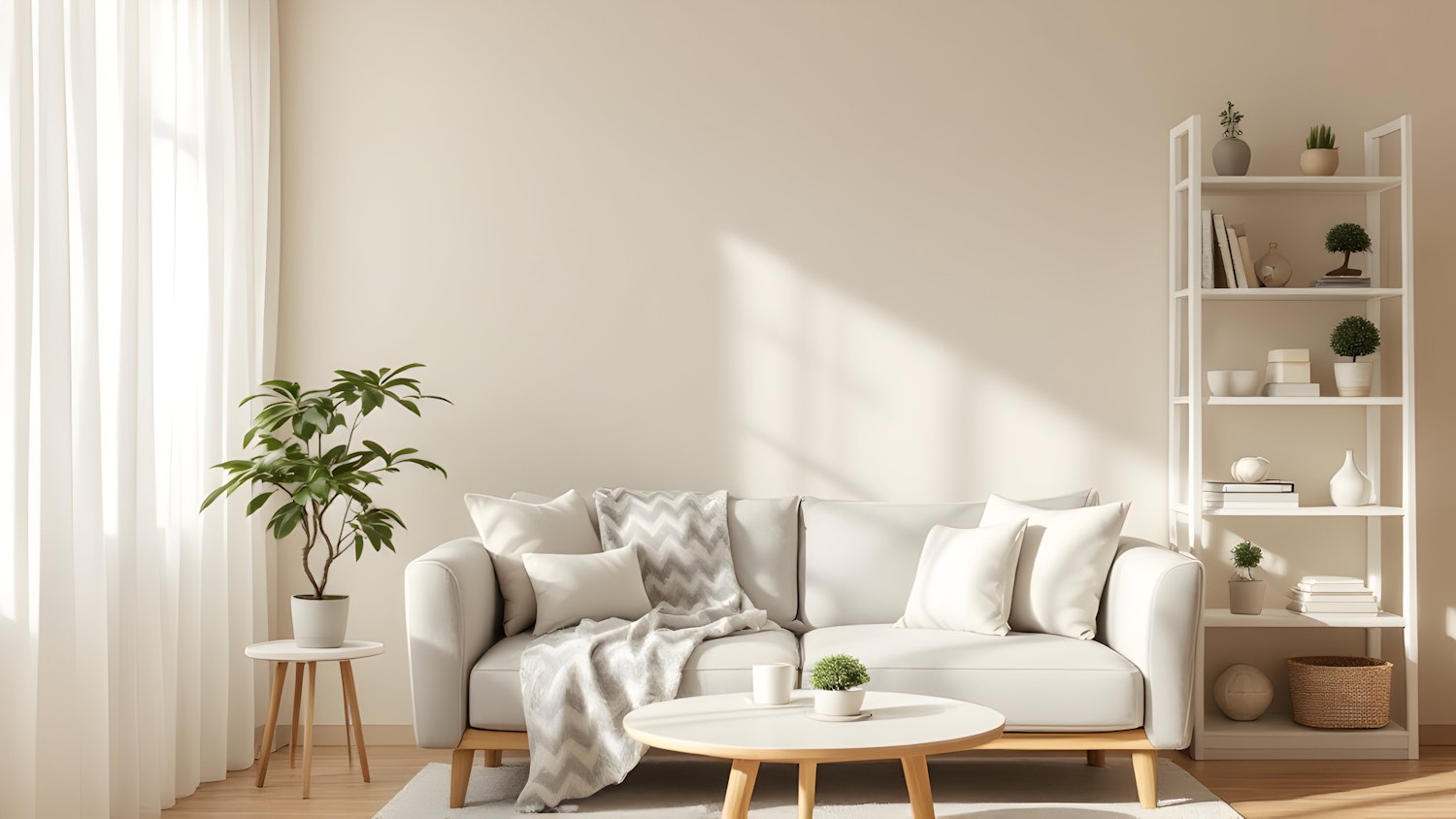 Bright minimalist living room with a white sofa, wooden coffee table, potted plants, and sunlight streaming through sheer curtains.