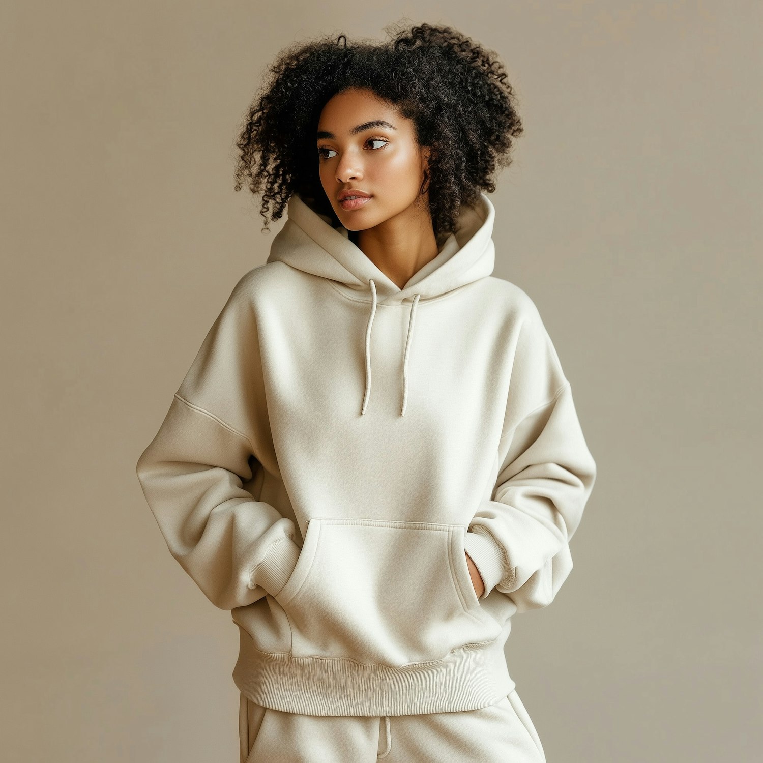 Stylish young woman in a cream oversized hoodie and sweatpants, posing against a beige background with a casual and cozy vibe.