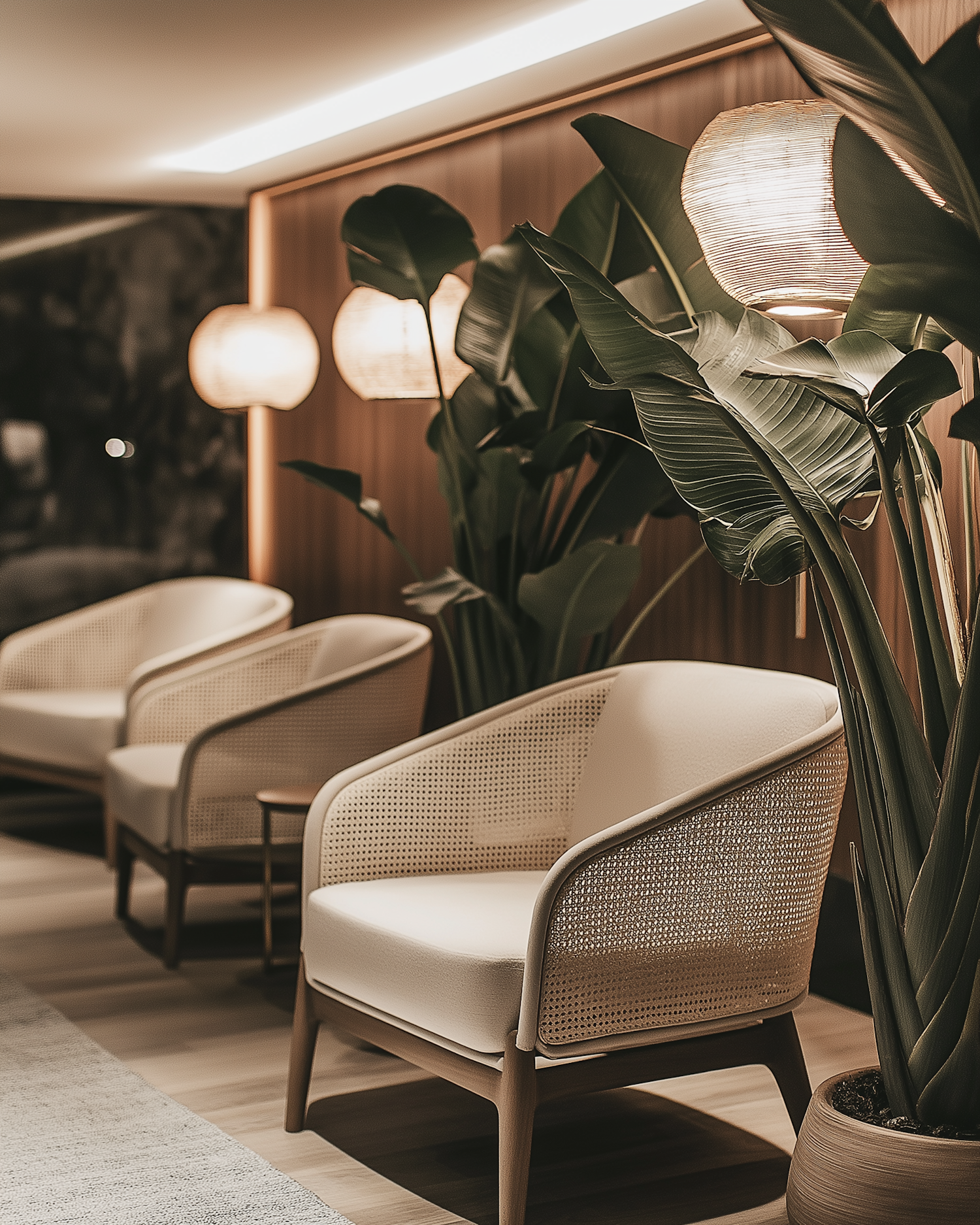 Modern seating area with cream armchairs, wooden accents, lush plants, and warm rattan lighting for a cozy, stylish vibe.