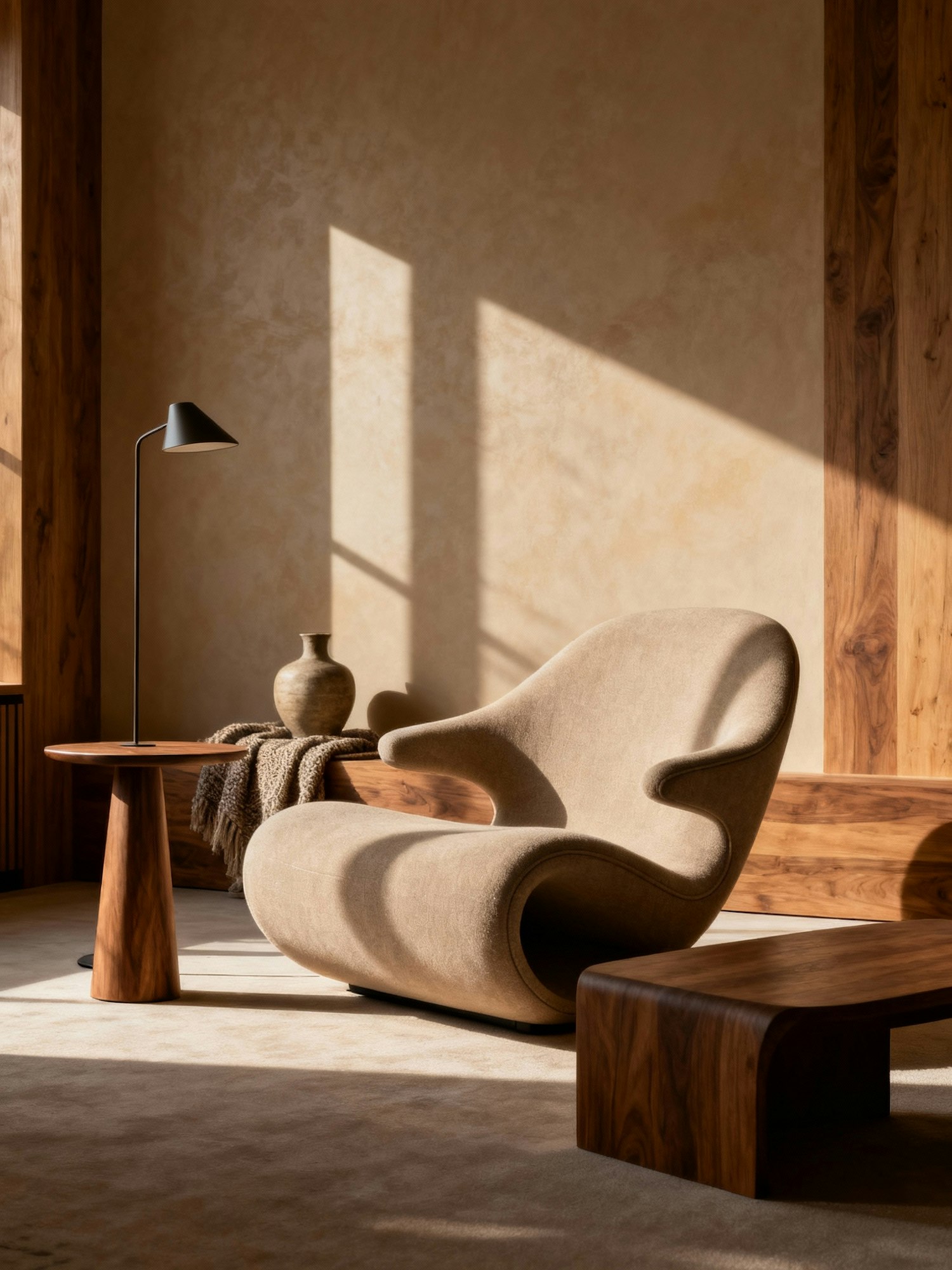 Professional interior design photography, warm and textured atmosphere, soft natural lighting, retro-modern aesthetic, mid-century inspired furniture, crafted wooden details, neutral tones with accents of earthy colors, editorial style, timeless and sophisticated mood. A low-angle shot of a reading corner with an organic-shaped lounge chair and floor lamp. The camera emphasizes the height and sculptural form of the furniture, capturing the curves of the chair from below with soft natural light creating dramatic shadows.