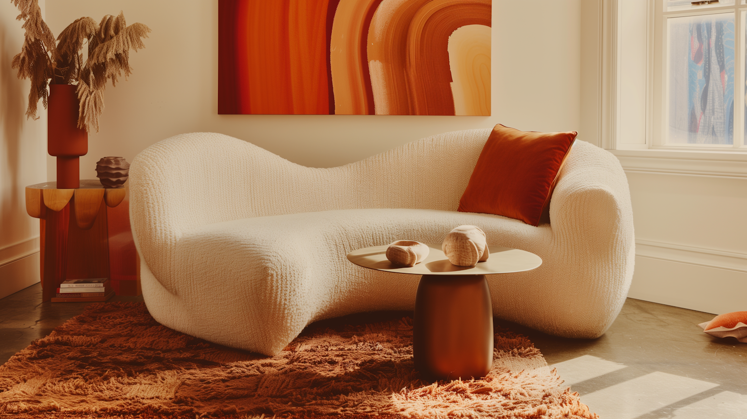 Warm and inviting living room with a curvy cream sofa, burnt orange accents, and a cozy shag rug. Perfect for modern, minimalist decor lovers.