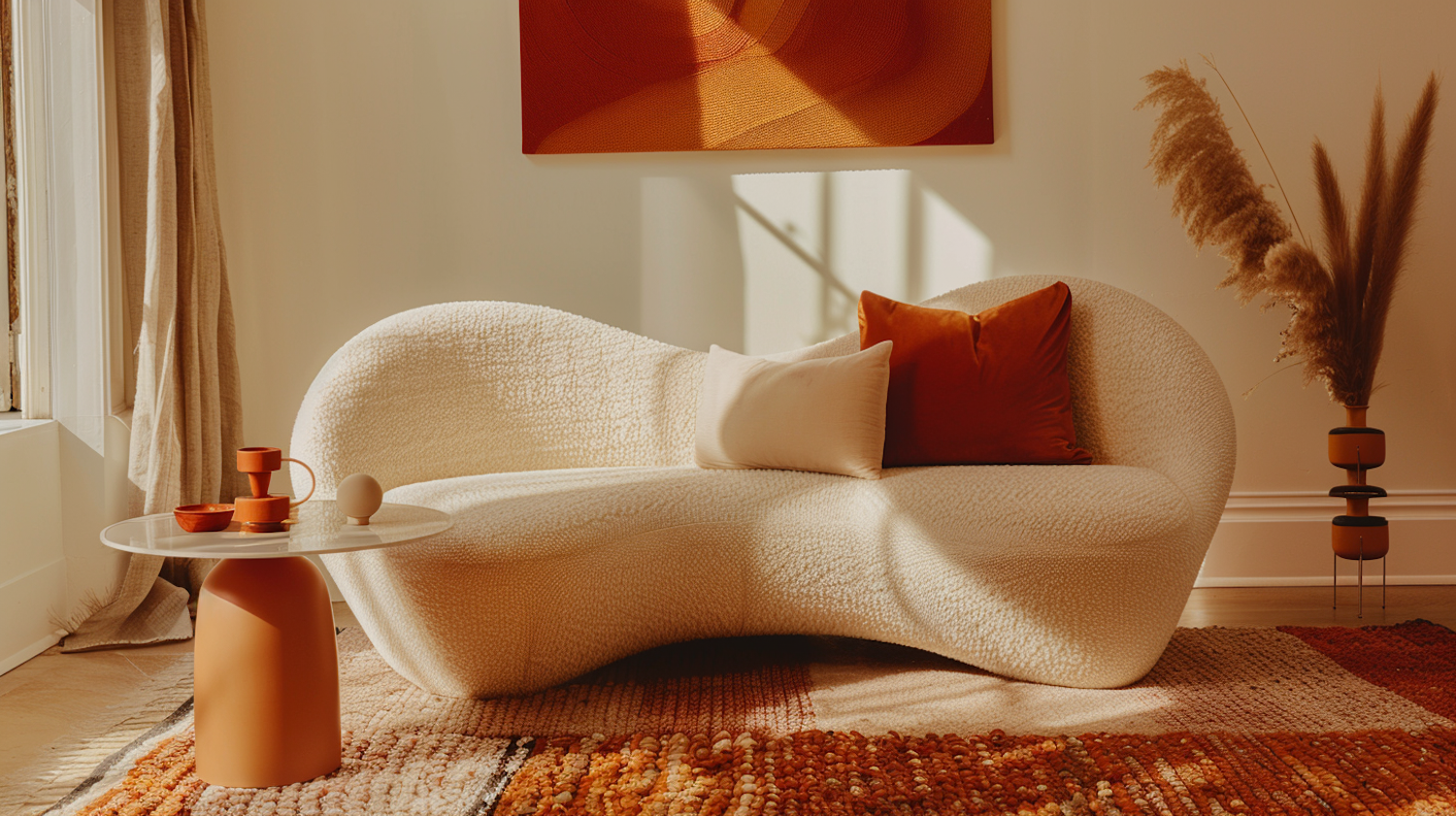 Modern living room with a boucle sofa, warm-toned decor, pampas grass, and sunlight streaming in for a cozy, earthy vibe.