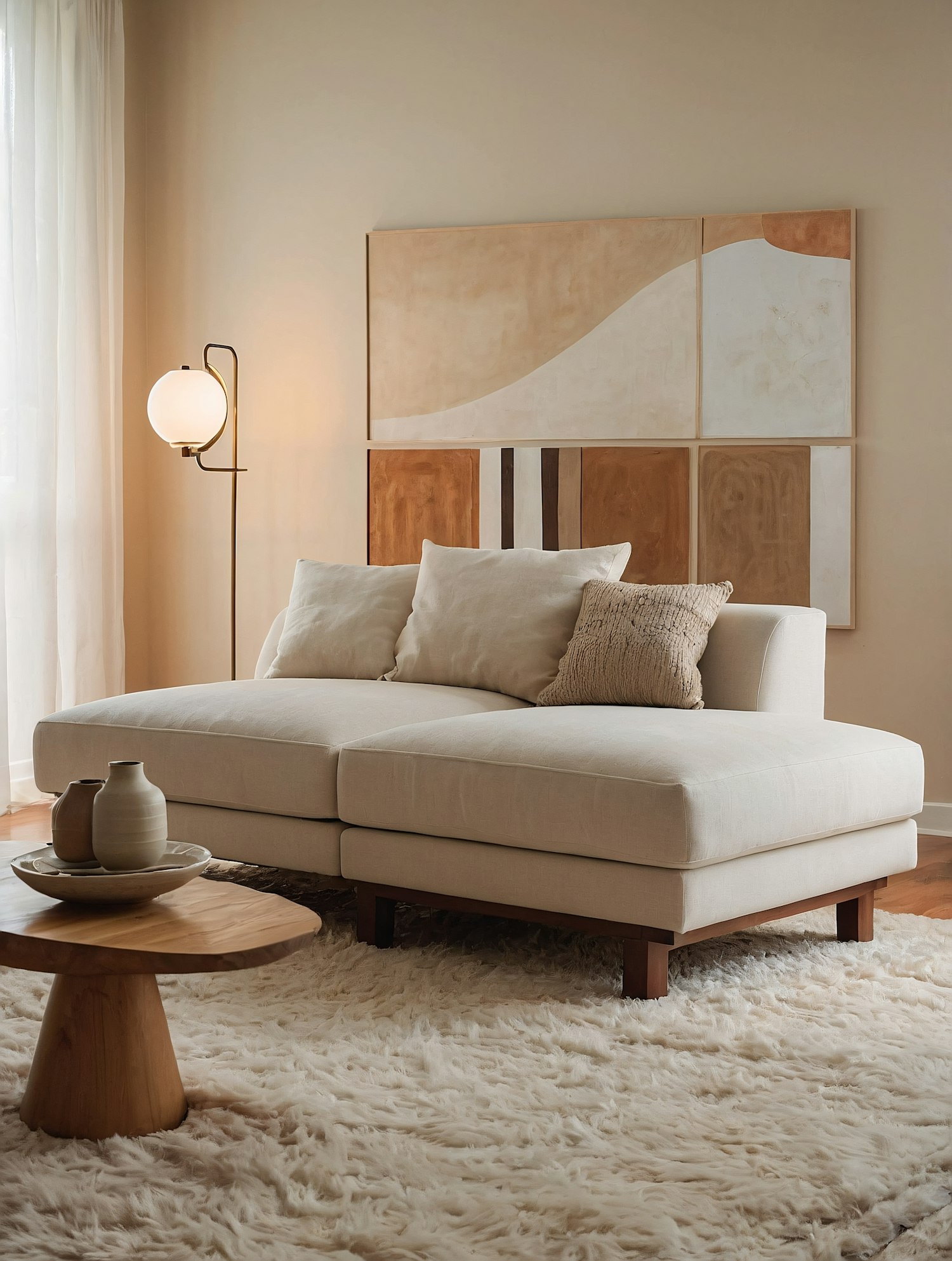 Neutral-toned living room with a cream sofa, shaggy rug, wooden coffee table, abstract wall art, and a modern floor lamp.
