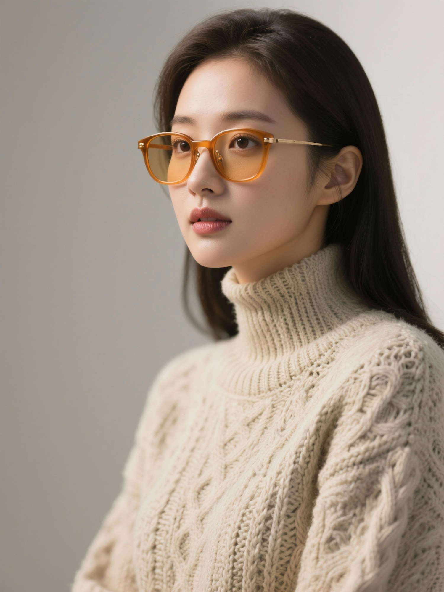 Stylish young korean woman, 24 years old, amber glasses, and a knitwear, gazing thoughtfully to the side, minimal studio background, soft natural lighting, high fashion editorial photography, detailed textures, sharp focus, photorealistic, 8k resolution --ar 2:3 --v 6 --q 2 --style raw