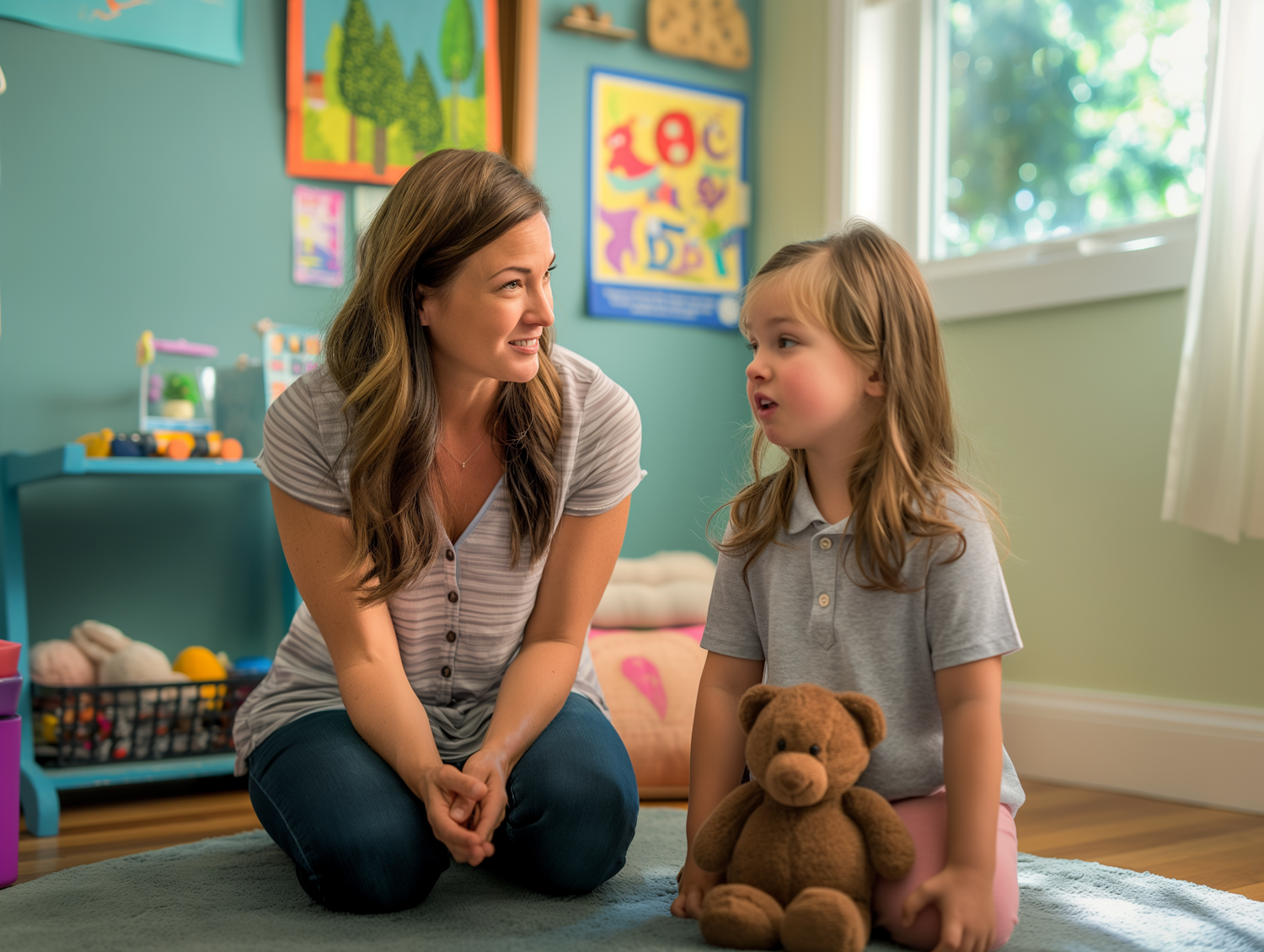 Woman and child in a colorful room, engaging in conversation. The child holds a teddy bear, surrounded by toys and artwork.