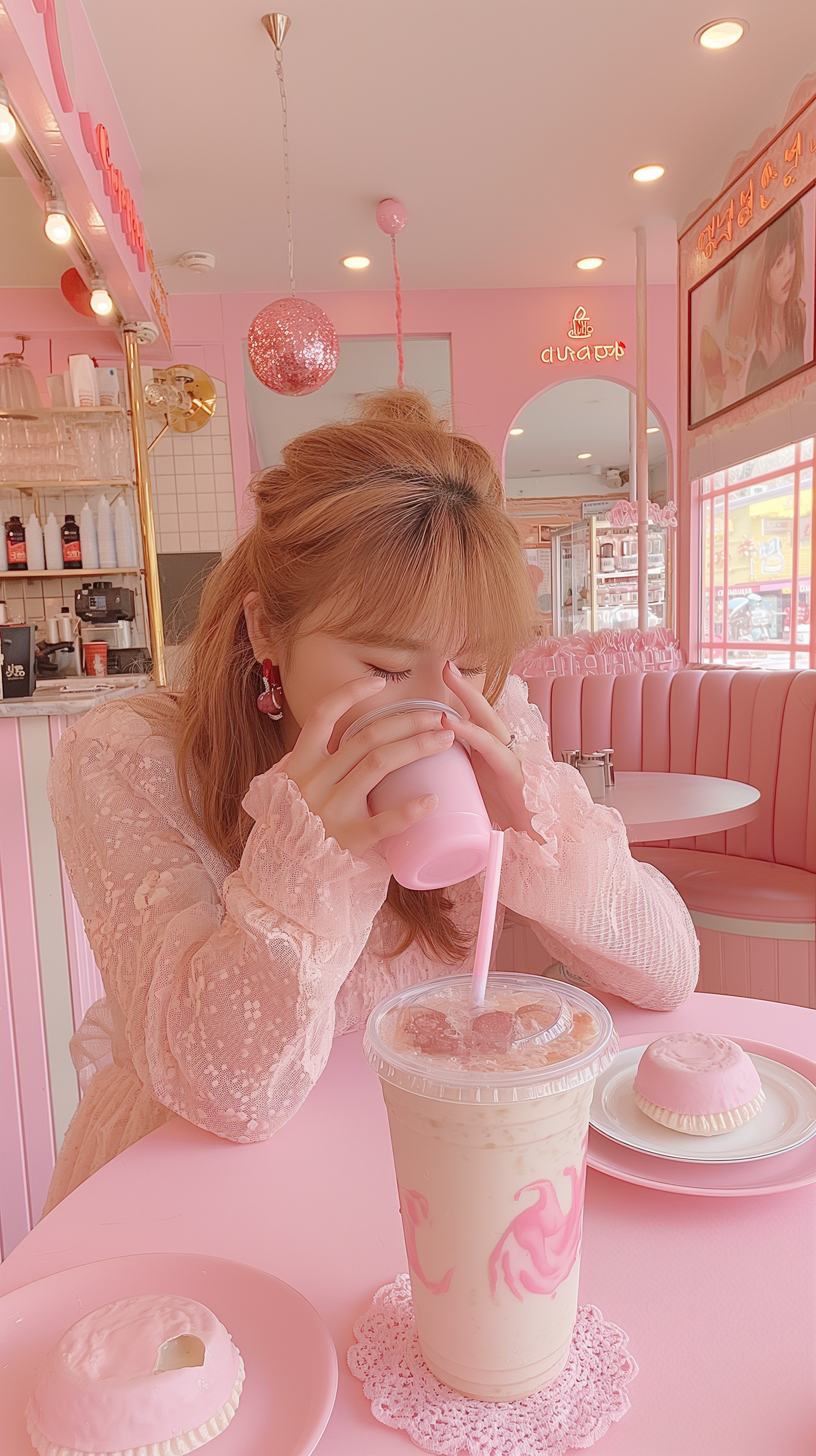 Young woman in a pink-themed cafe enjoying a drink, surrounded by pink decor and pastries.