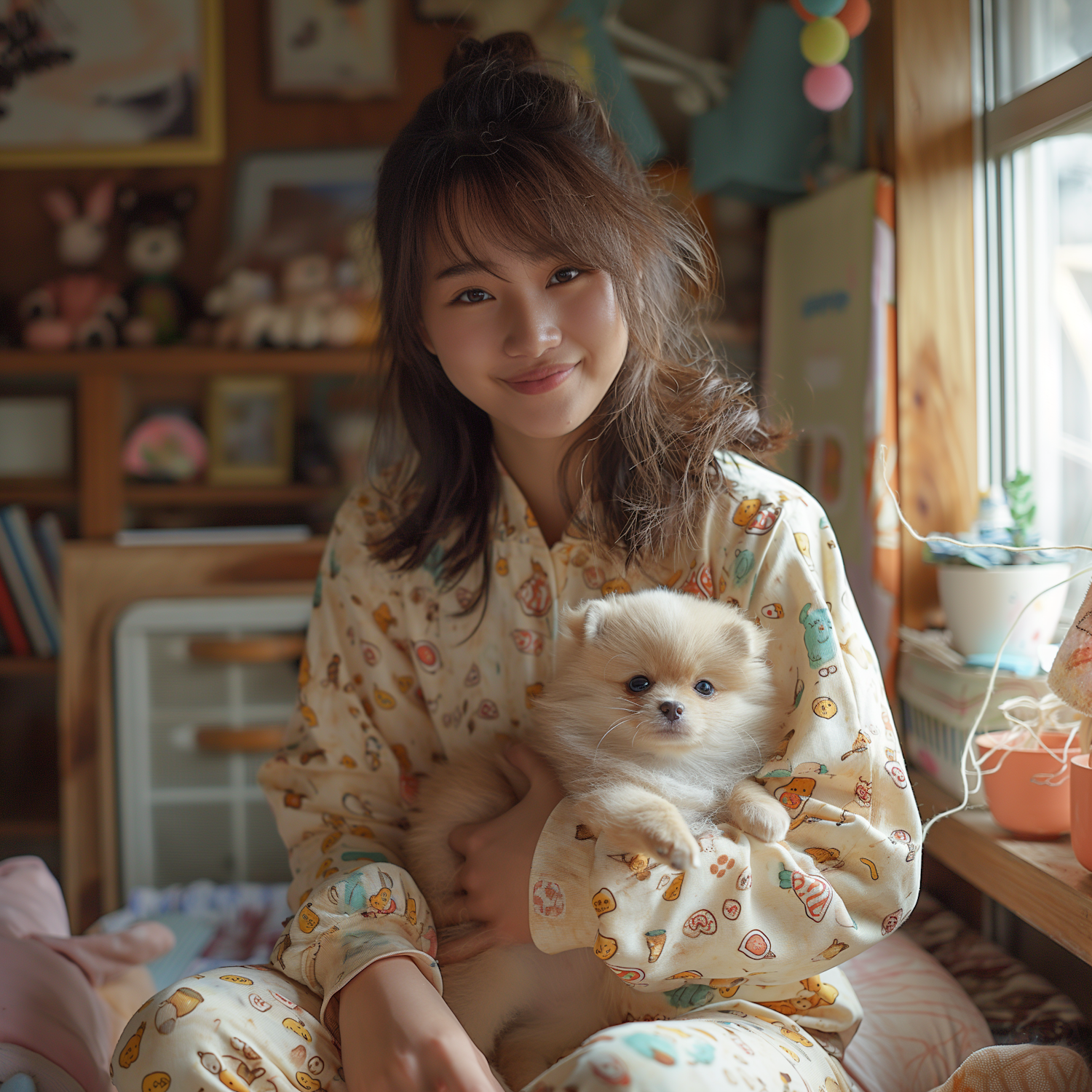 Asian woman in cartoon pajamas holding a fluffy Pomeranian puppy in a cozy, toy-filled room with soft lighting.