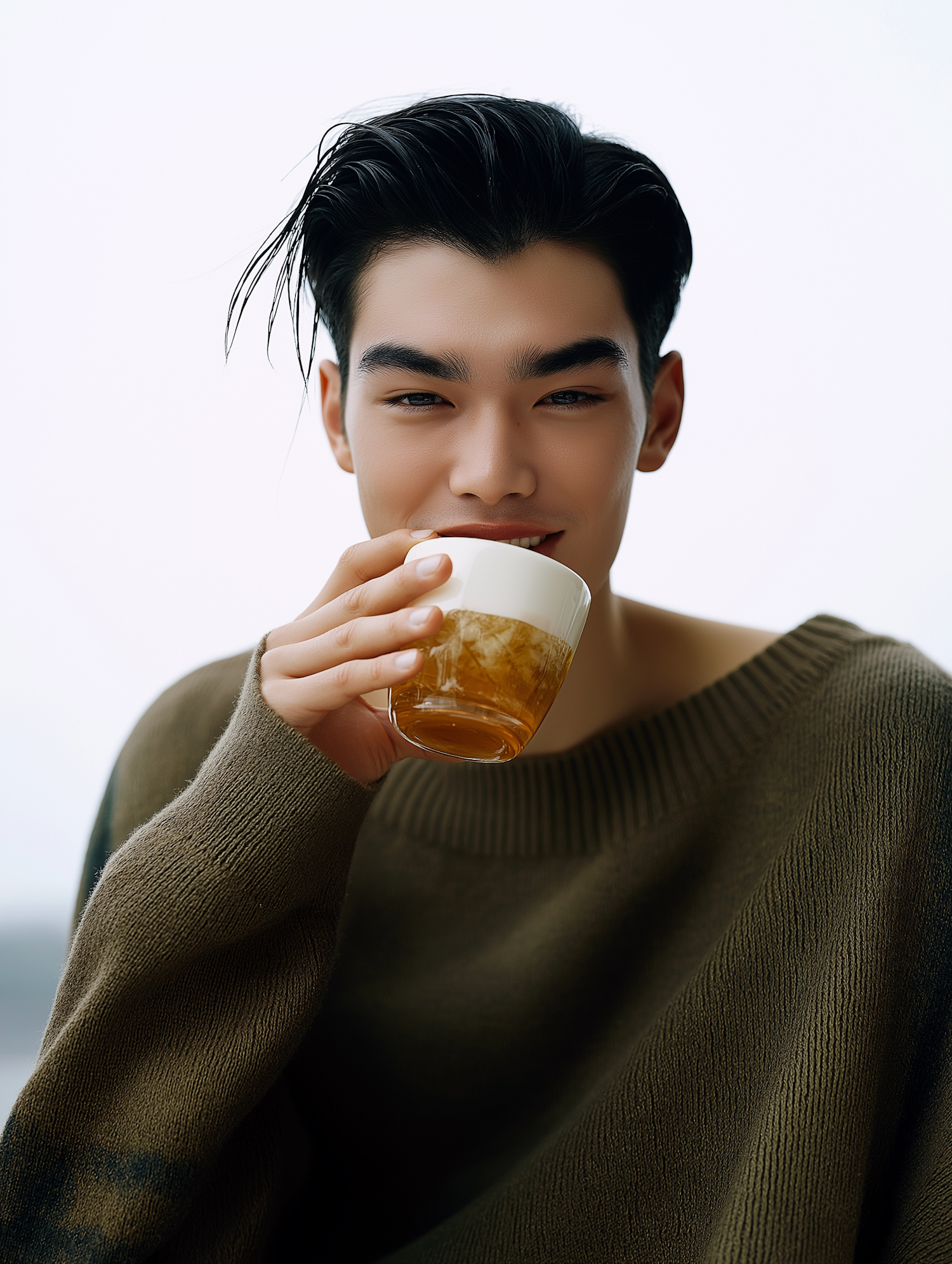 Asian man with dark hair and olive sweater enjoying a drink. Relaxed expression, fair skin, blurred background, cozy atmosphere.