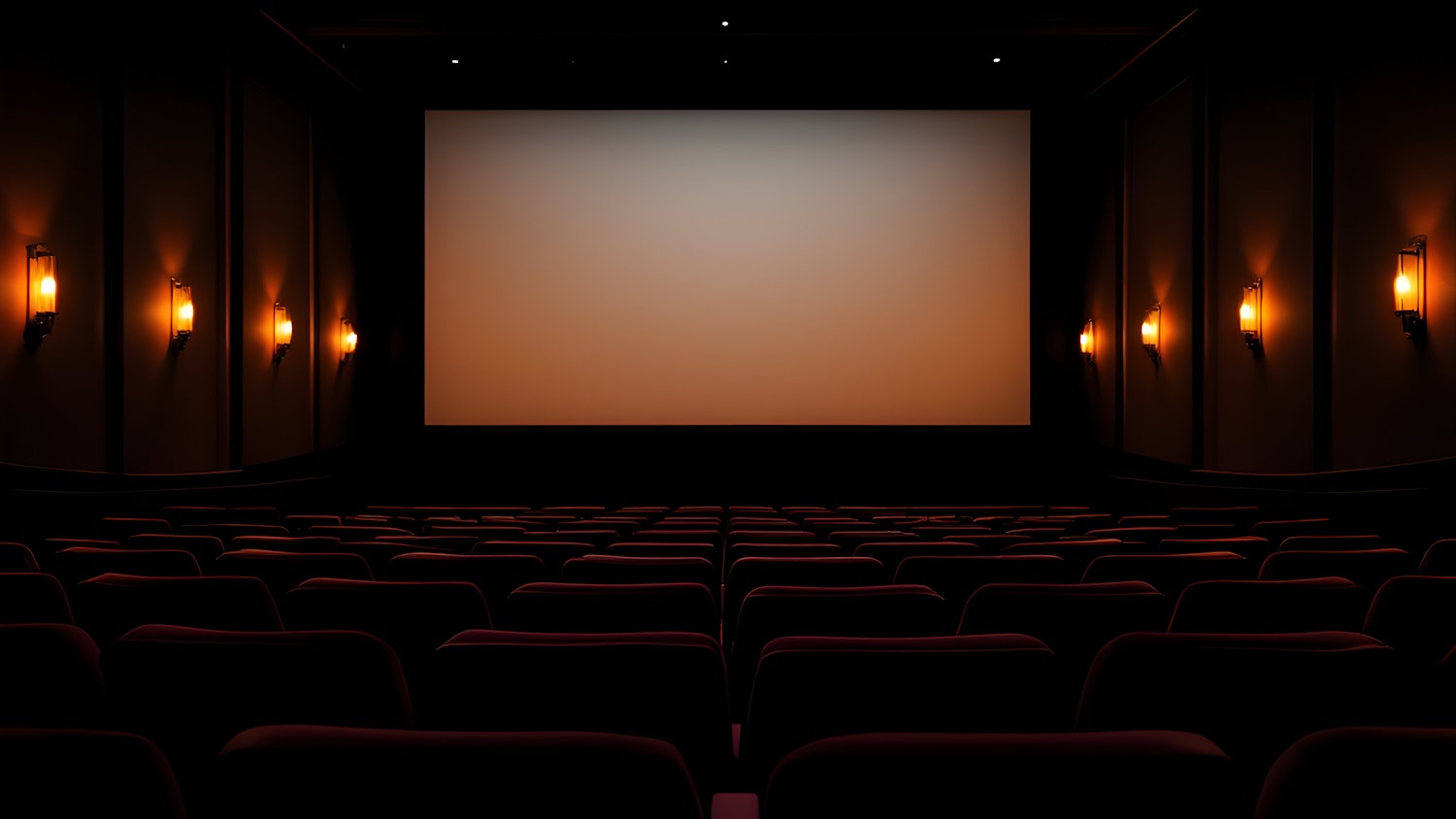 Empty movie theater with red seats, glowing wall sconces, and a blank screen ready for a film. Cozy and serene atmosphere.