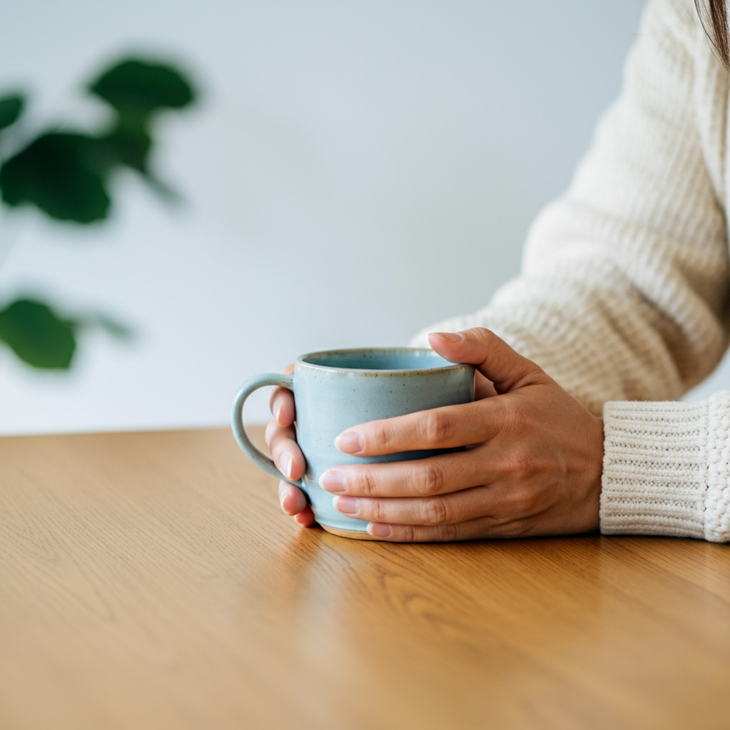 Close-up of hands holding a light blue ceramic mug on a wooden table, with a cozy sweater and blurred greenery in the background.
