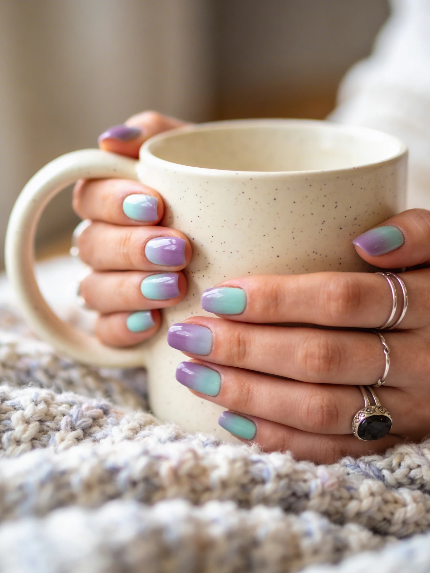 Close-up of hands with gradient purple and teal nails holding a beige mug, adorned with silver rings, against a cozy knitted background.