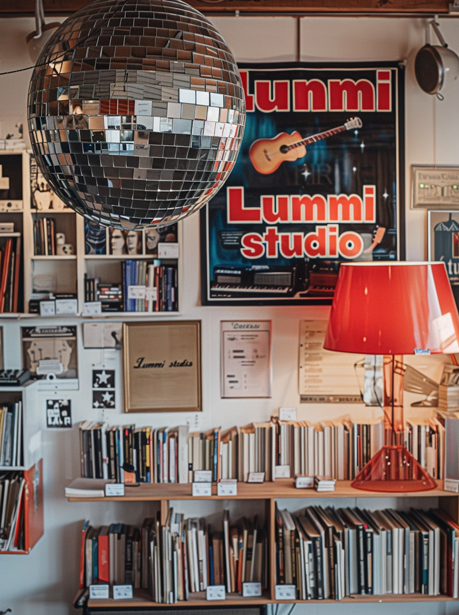 Cozy room with books, a disco ball, and a 'Lummi studio' poster. A red lamp adds warmth to the creative space.
