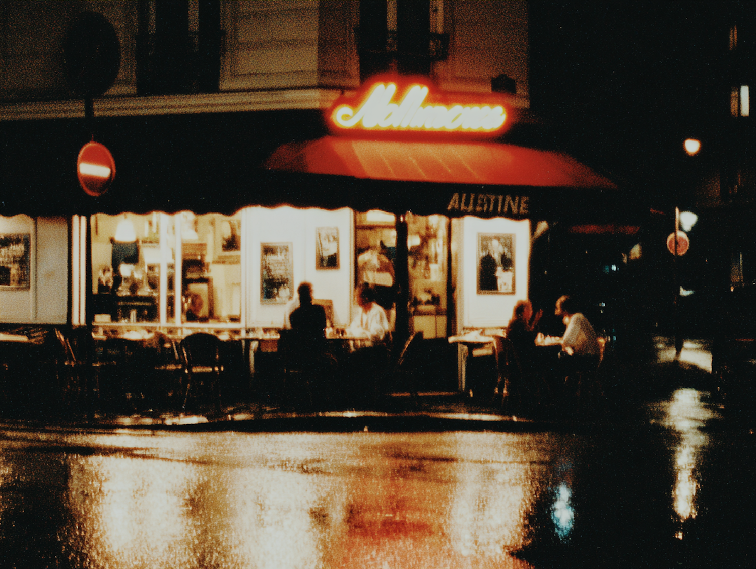 A cozy café at night with warm lights, a red awning, and patrons enjoying conversations, reflecting on a wet street.