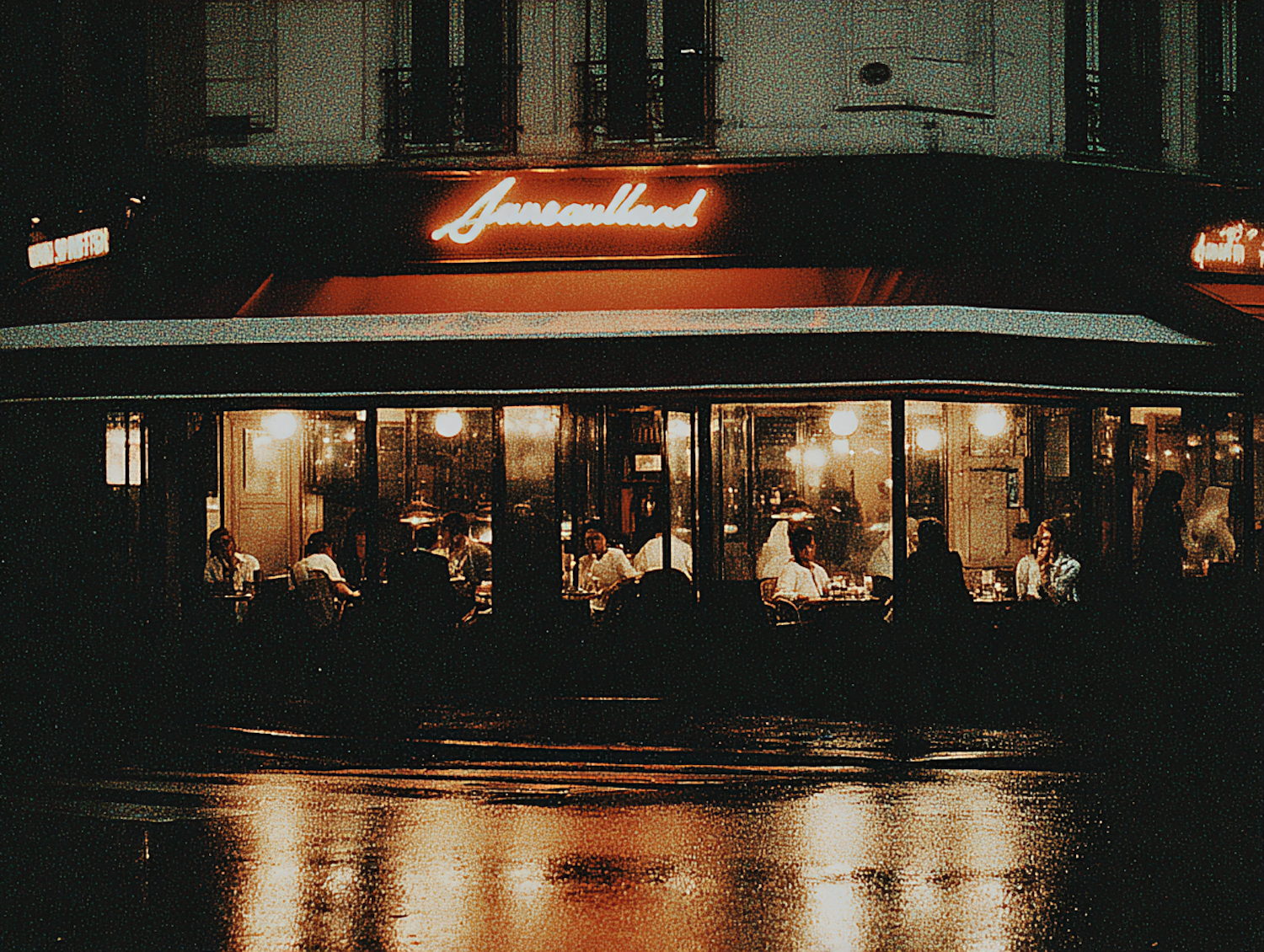 A warmly lit café at night with patrons visible through large windows, reflecting a cozy and inviting urban atmosphere.