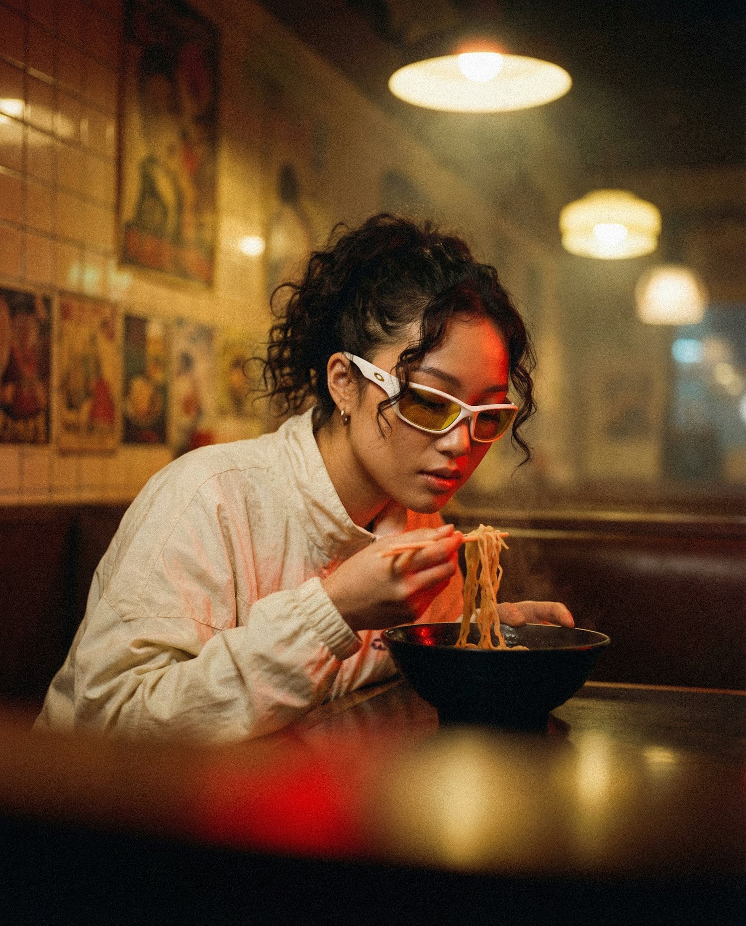 A young woman enjoys a bowl of noodles in a cozy, warmly lit restaurant with vintage decor and a nostalgic ambiance.