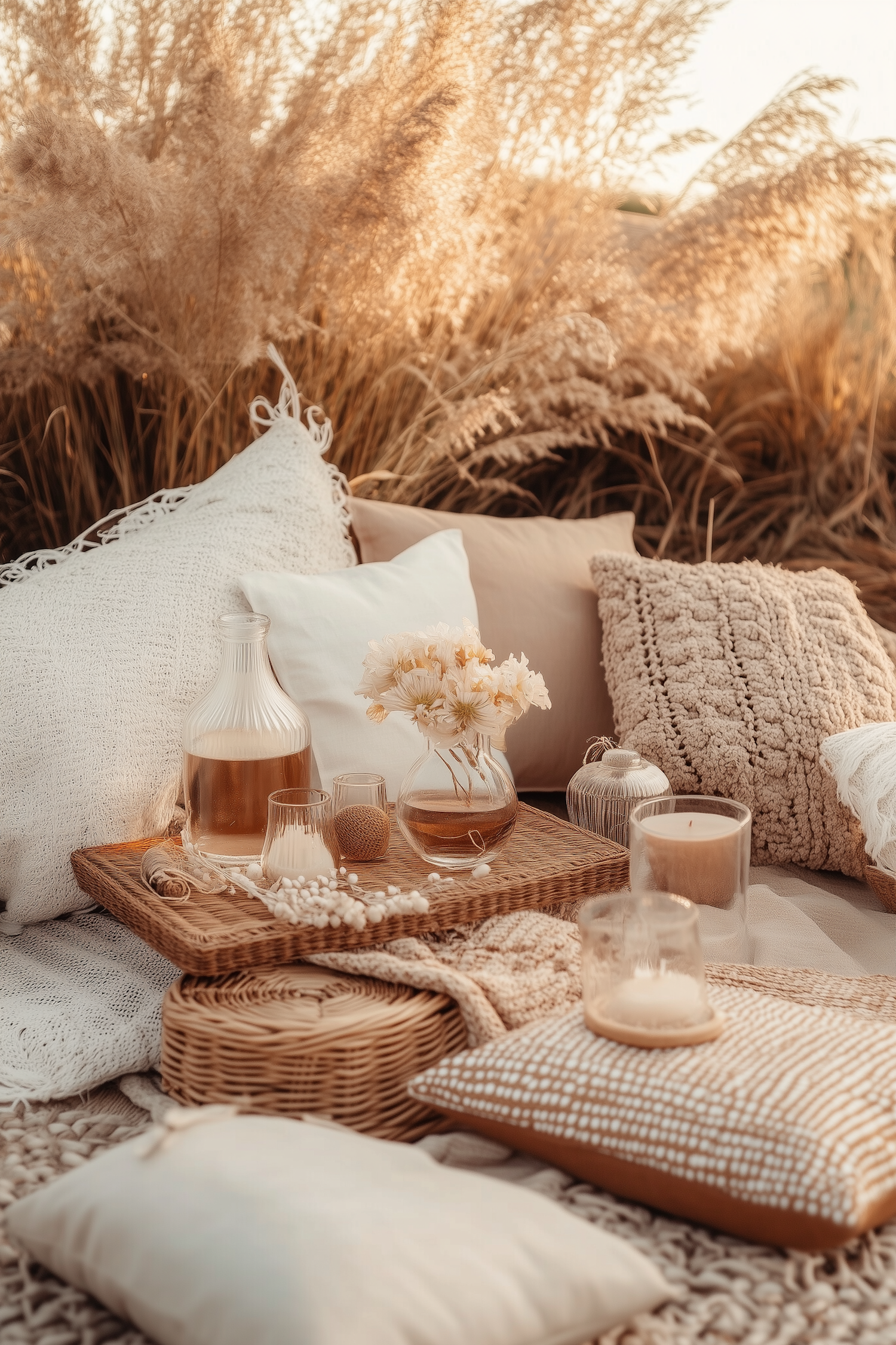 Cozy bohemian outdoor setup with pillows, a woven tray, glass carafe, and pampas grass backdrop, creating a warm, inviting atmosphere.