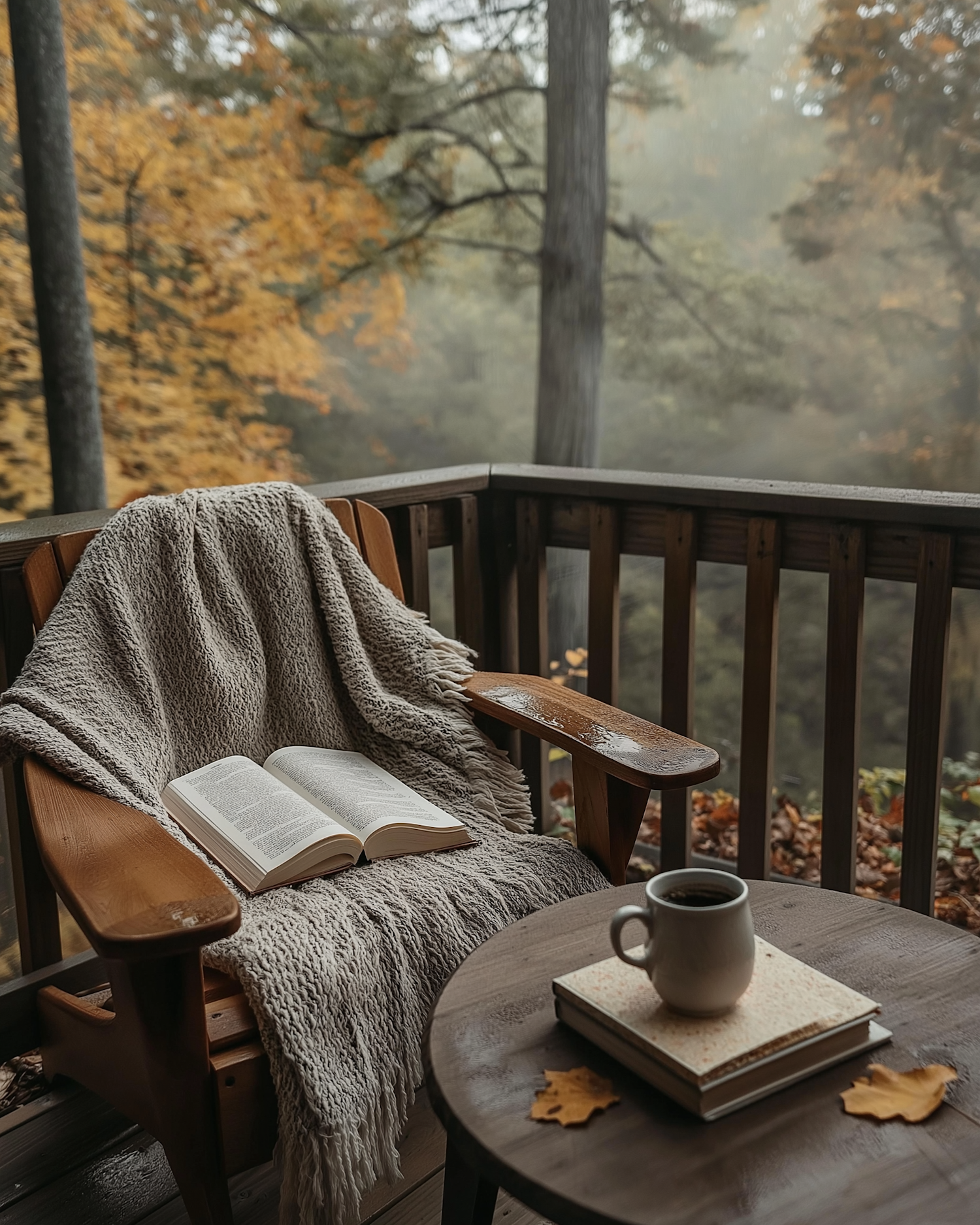 Cozy autumn deck with a chair, blanket, open book, and coffee. Surrounded by colorful fall foliage, creating a serene atmosphere.