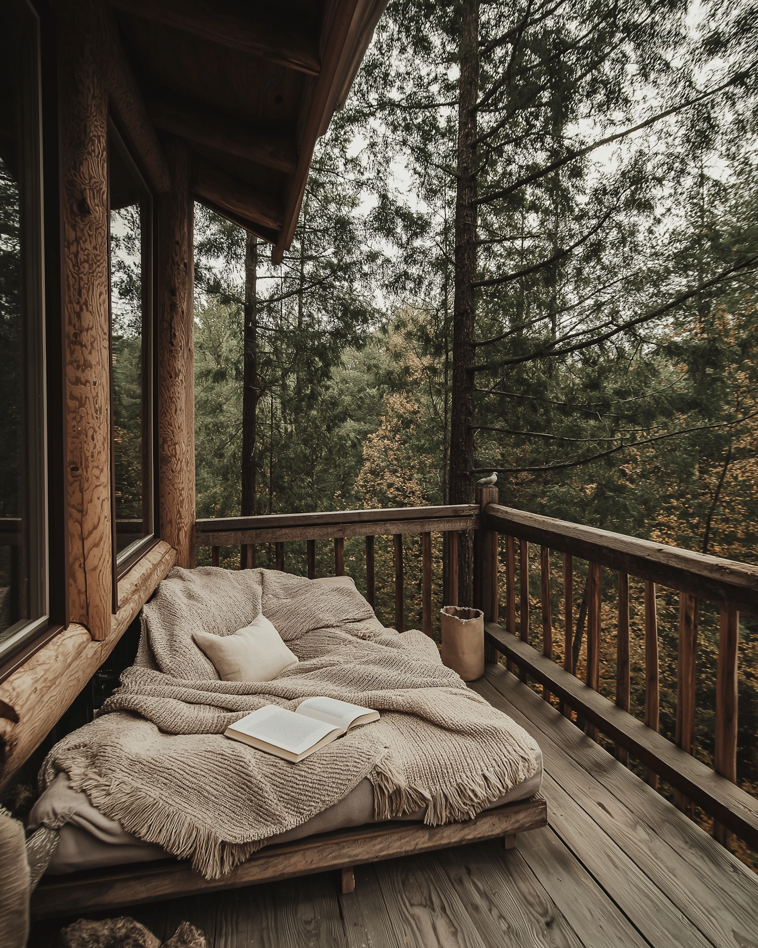 Cozy outdoor deck with a rustic daybed, soft blanket, and open book, surrounded by lush trees for a serene reading spot.