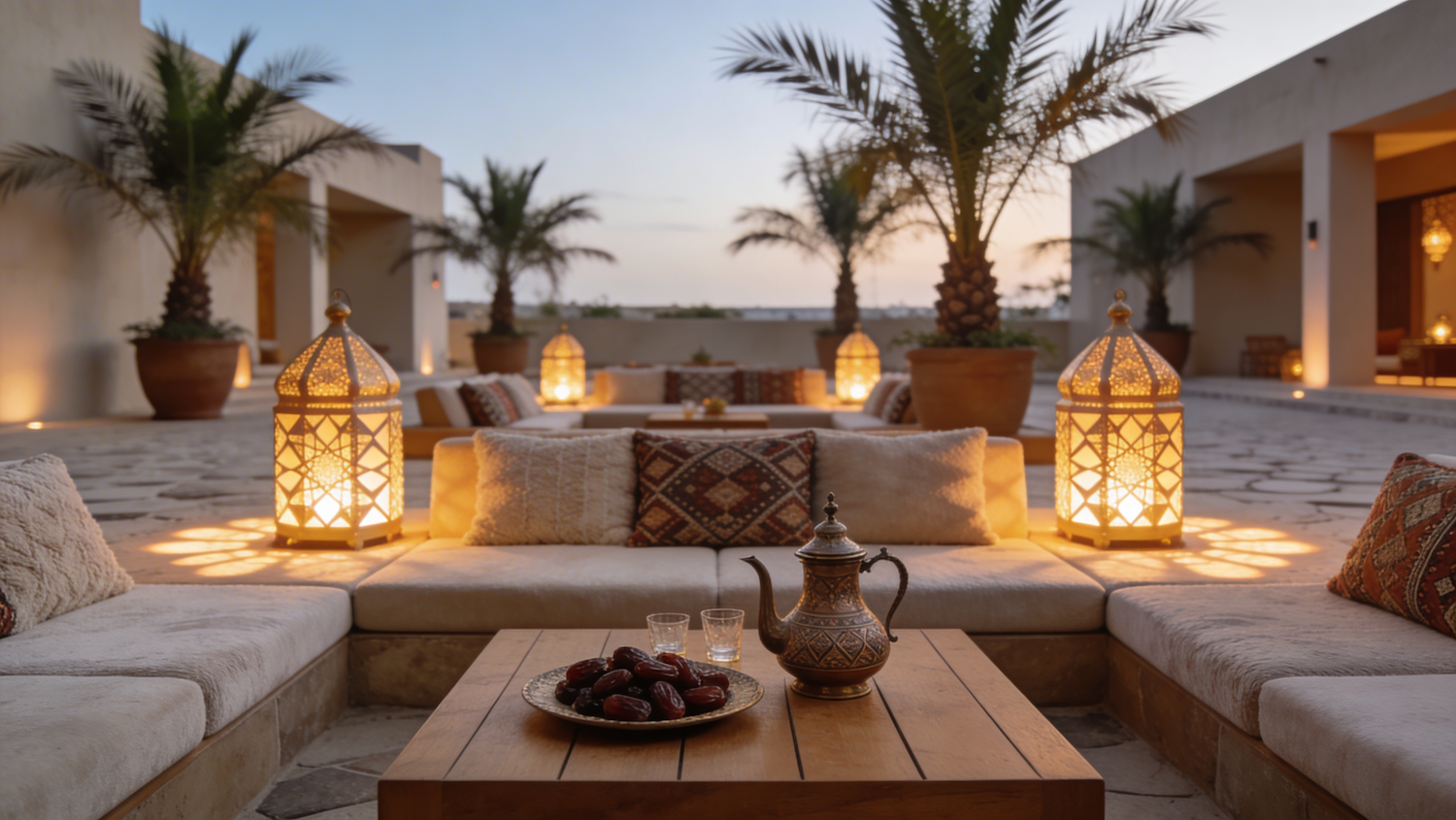 Cozy outdoor seating with lanterns, a teapot, and dates, surrounded by palm trees and warm lighting for a serene evening ambiance.