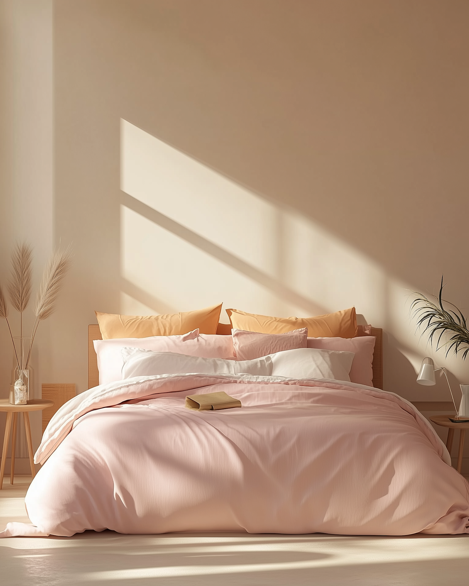 Cozy bedroom with pastel pink bedding, peach pillows, and natural sunlight. Minimalist decor includes pampas grass and a bedside lamp.