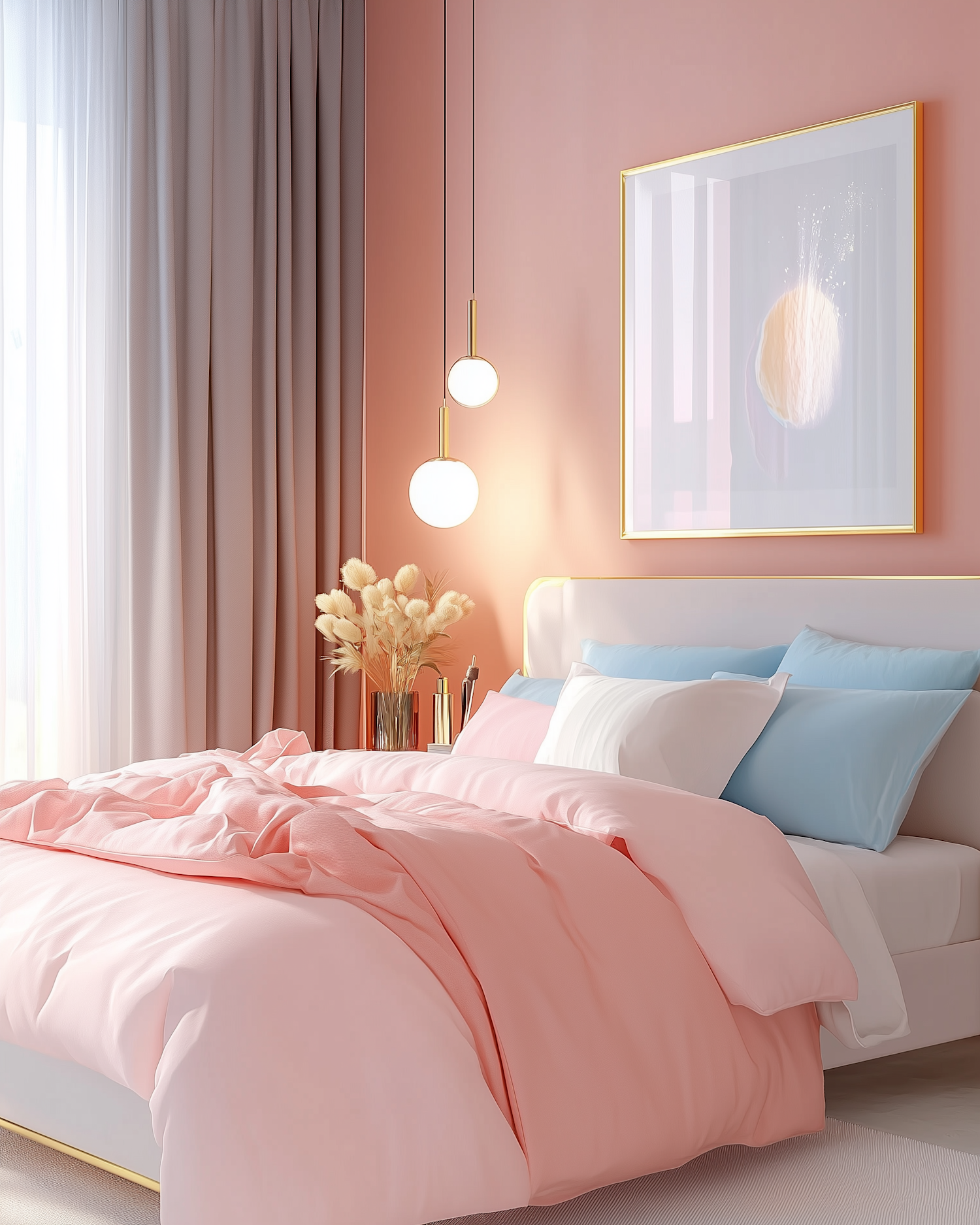 Soft pastel bedroom with pink bedding, blue pillows, pendant lights, and pampas grass decor for a cozy, modern vibe.