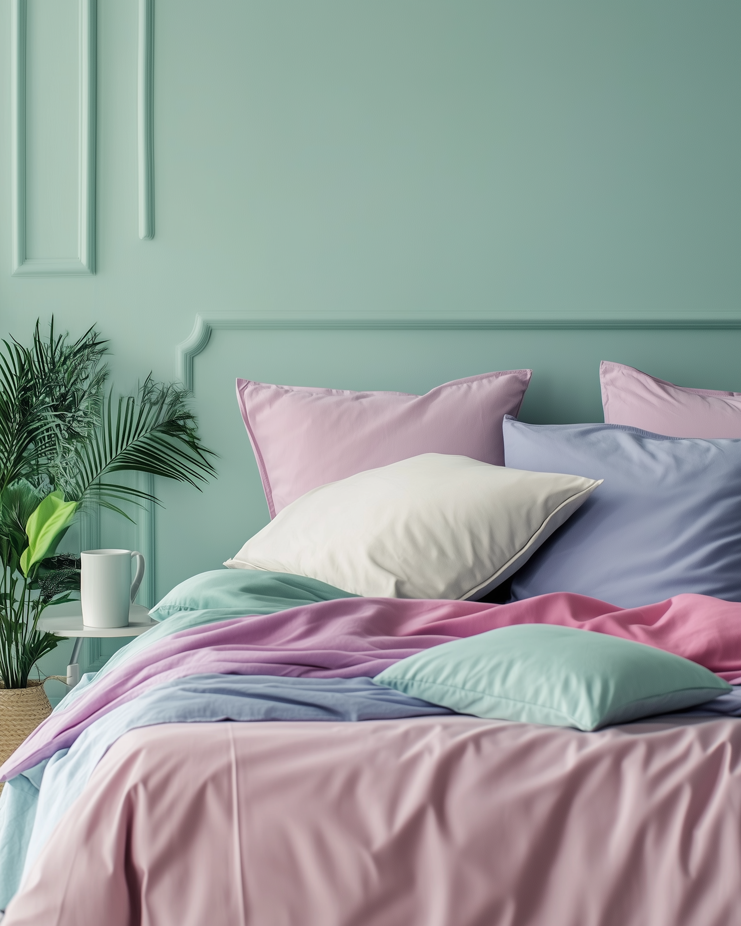 Pastel bedding in pink, blue, and green with a mint green wall, decorative molding, and a cozy vibe. Includes a plant and white mug.