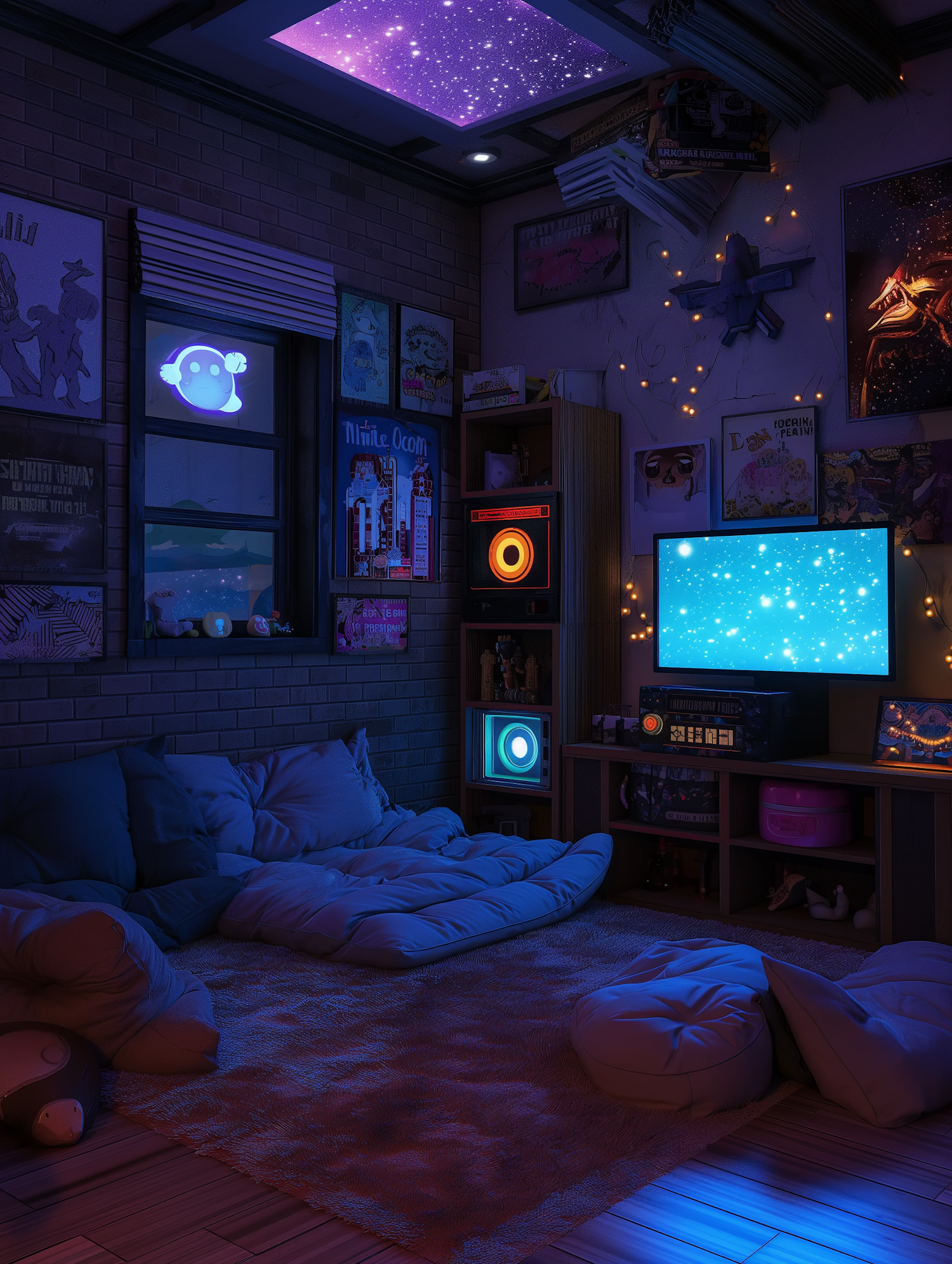 Cozy room with starry ceiling, plush seating, and neon lights. A blue screen and posters create a whimsical, futuristic vibe.