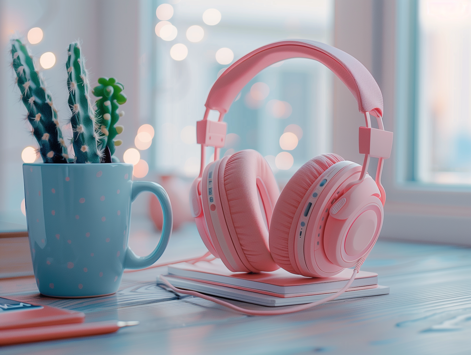 Pastel pink headphones on notebooks beside a polka dot mug with cacti, set on a wooden desk with warm bokeh lights in the background.