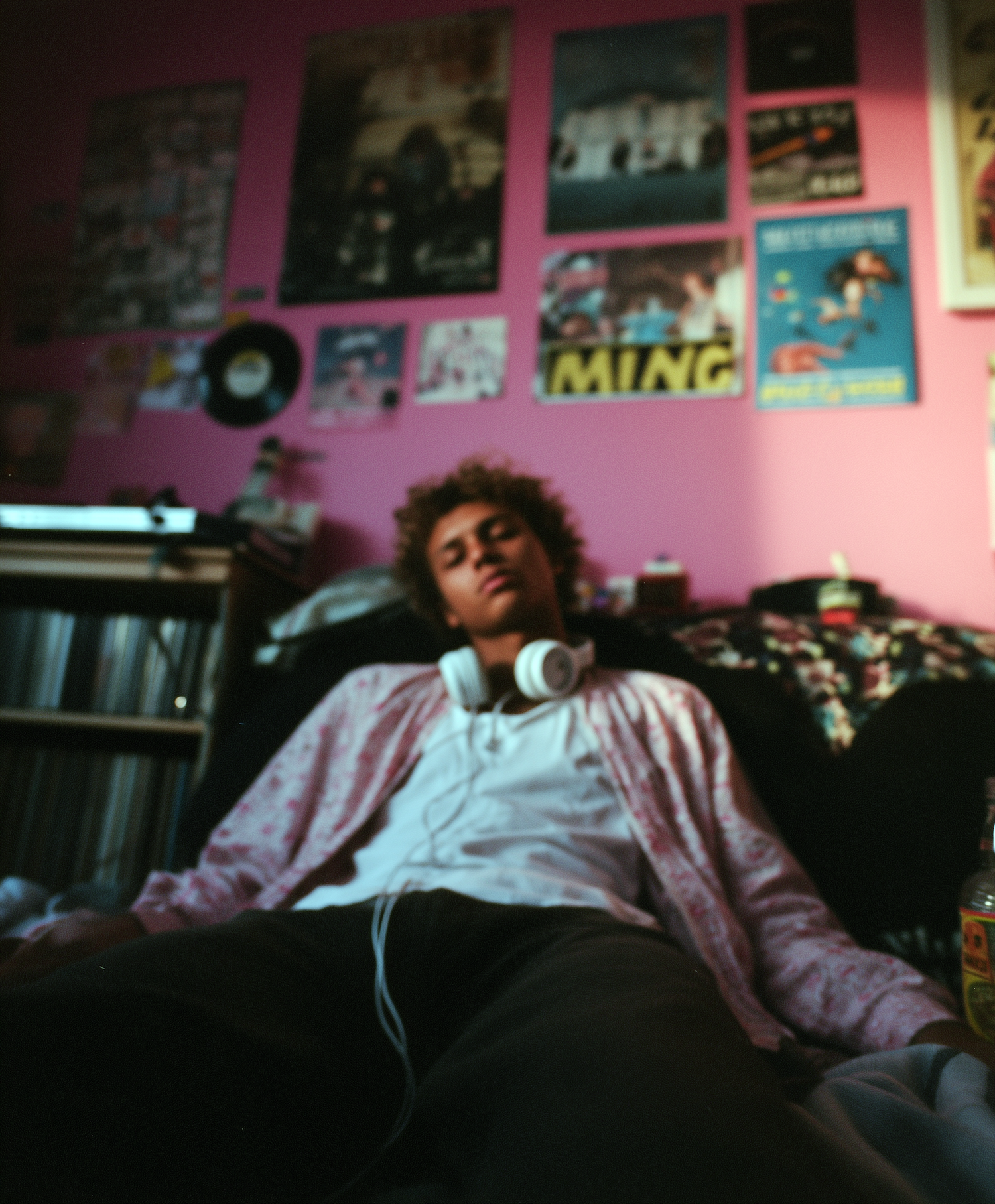 A relaxed individual in a vibrant room with pink walls and posters, wearing headphones and surrounded by personal items and vinyl records.