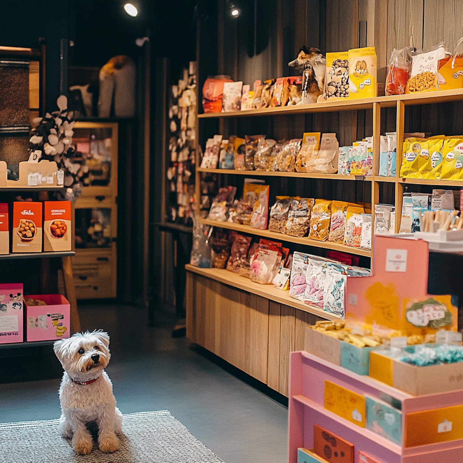 A fluffy white dog sits in a cozy pet store surrounded by colorful pet food packages and treats on wooden shelves.